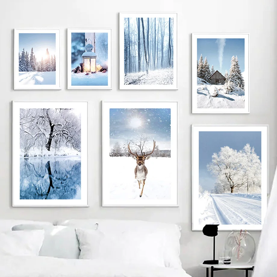 Зимний снег, солнечный свет, лес, озеро, олень, каюта, скандинавские постеры и принты, настенная живопись, холст, картины для декора гостиной