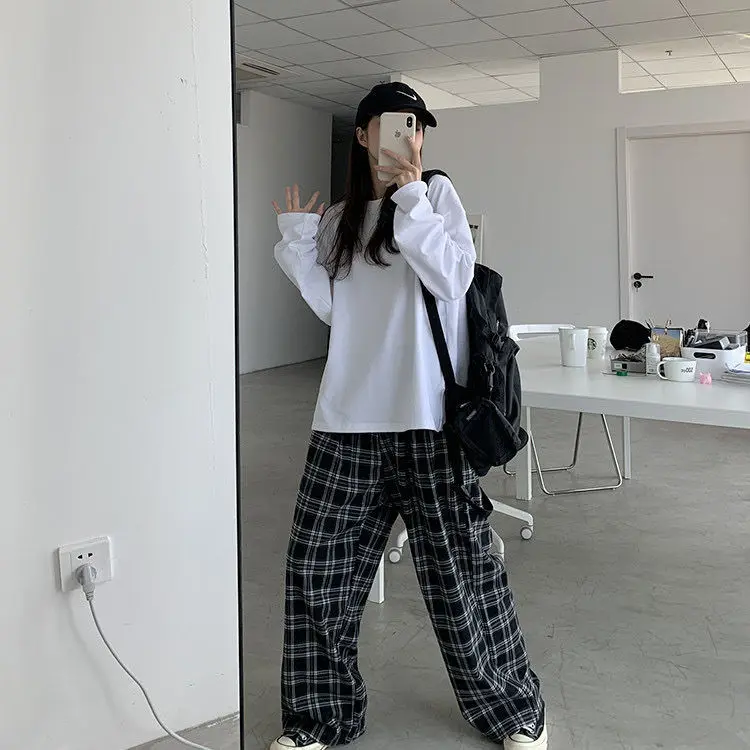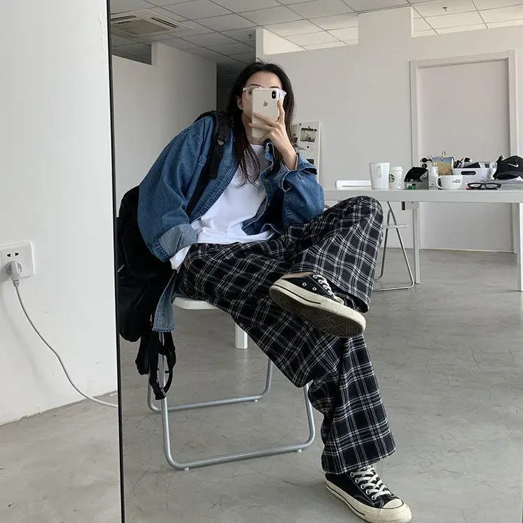 Женские брюки в клетку большого размера 3XL, повседневные свободные брюки с широкими штанинами, прямые брюки в стиле ретро для подростков, уличная одежда унисекс в стиле хип-хоп, 2021