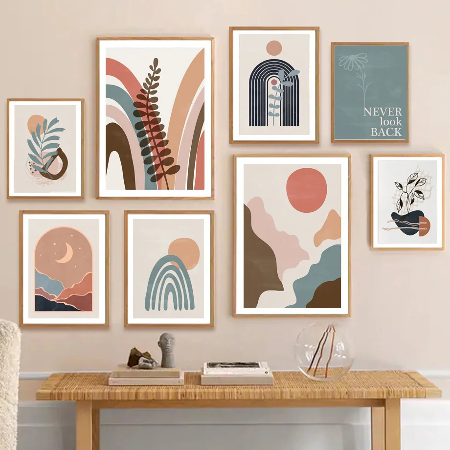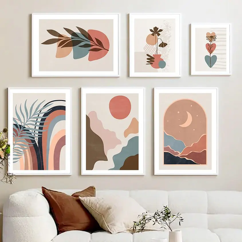 Абстрактная Картина на холсте с изображением солнца, луны, Листьев, геометрического пейзажа, настенная живопись, скандинавские плакаты и печать, настенные картины для декора гостинойМатериал: экологически чистый хлопокХарактеристика: солнцезащитный, водонепроницаемый, никогда не выцветает