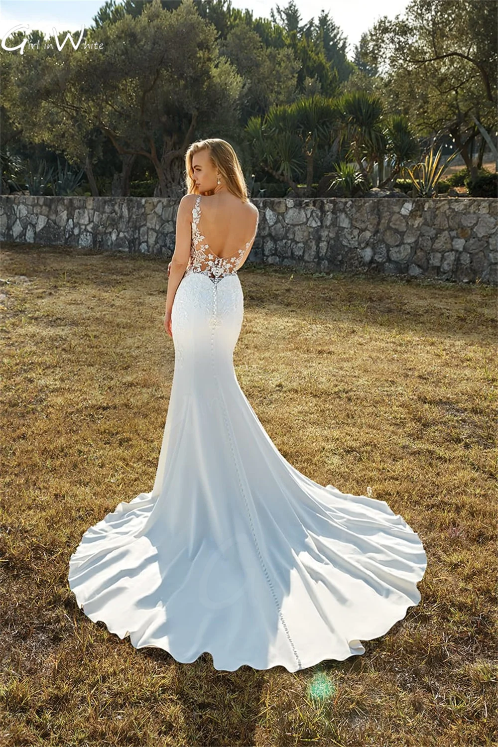 Атласное свадебное платье со шлейфом, с эффектом иллюзии