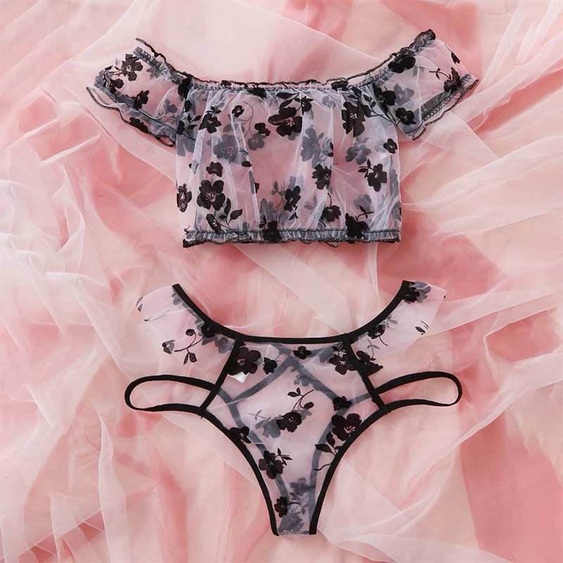 Сексуальное нижнее белье с оборками, кружевной бюстгальтер с цветочной вышивкой, Комплект трусиков, женское нижнее белье, прозрачное эротическое белье, сексуальный корсет, женское нижнее белье