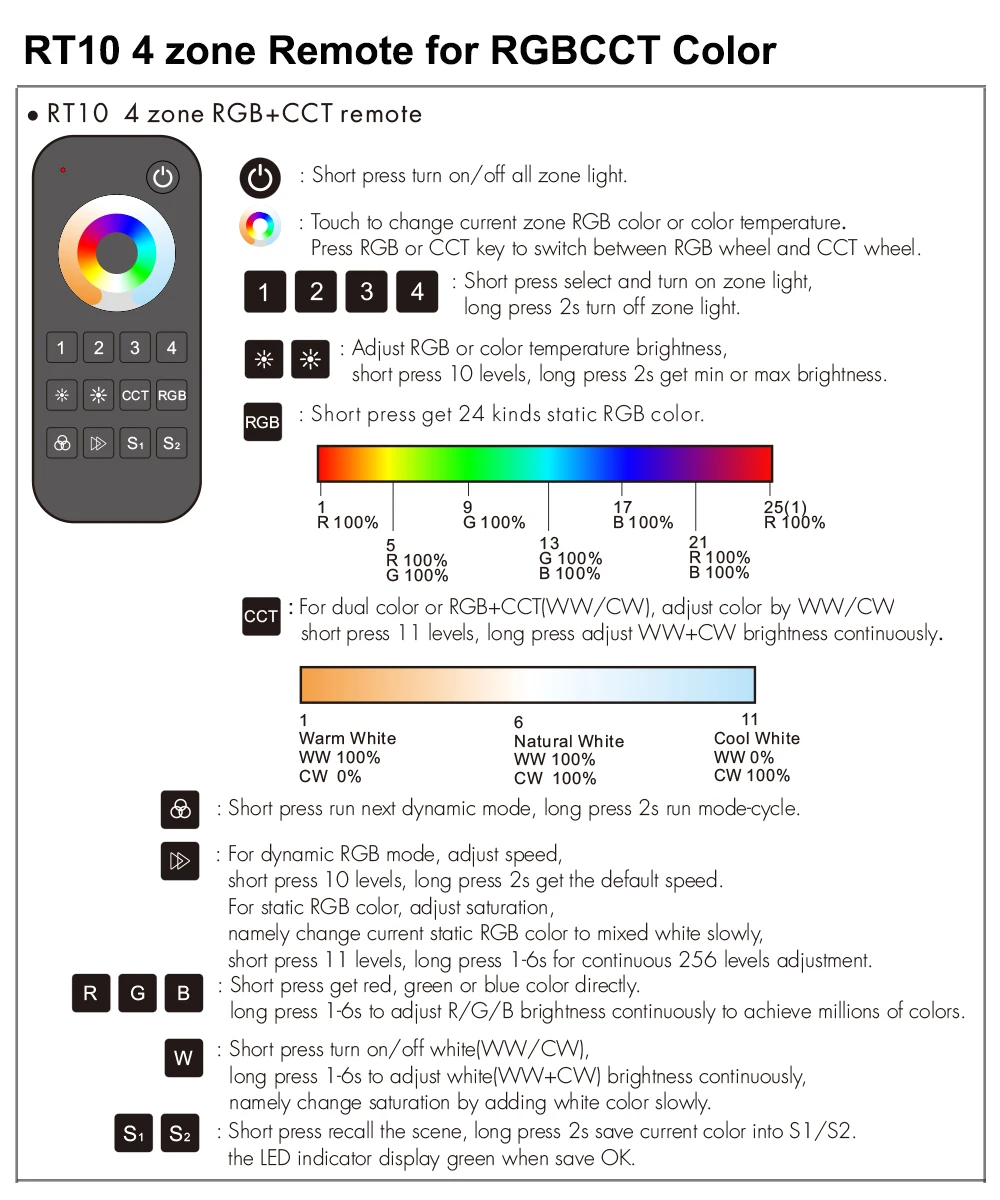 RT10: 4 зоны пульт дистанционного управления для RGBCCT светодиодной ленты (для WZ5)