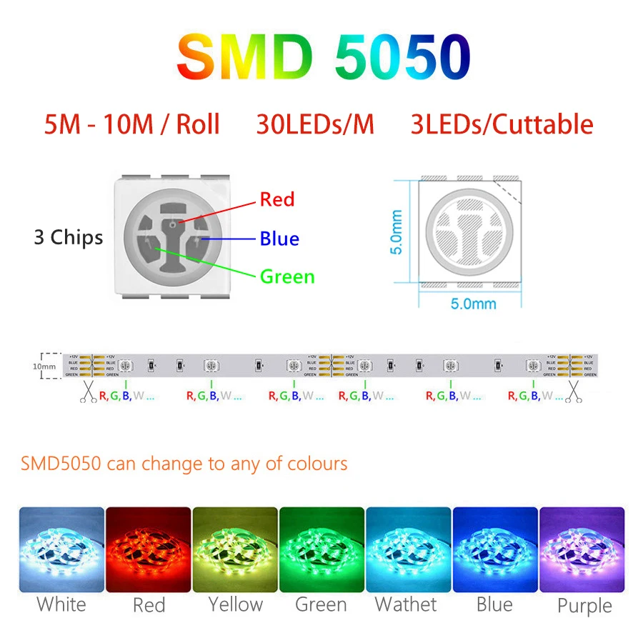 * 5050 RGB светодиодные лентыТип СВЕТОДИОДА: SMD 5050 (имеет белый свет)Количество: 5 м 30 светодиодов/метрРабочее Входное напряжение: 12 В постоянного токаРабочая температура: -20 ° ~ 60 °Уровень водонепроницаемости: IP65 Водонепроницаемый или IP20 не водонепроницаемый * 2835 RGB светодиодные лентыТип СВЕТОДИОДА: SMD2835 (без белого света)Количество: 5 м 54 СВЕТОДИОДА/метрРабочее Входное напряжение: 12 В постоянного токаРабочая температура: -20 ° ~ 60 °Уровень водонепроницаемости: IP65 Водонепроницаемый или IP20 не водонепроницаемый • Контроллер Wi-FiВес нетто: 45 гВес брутто: 60 гВходное напряжение: DC5 ~ 24 ВВыход: 3 канала (RGB)Выходной ток: 6А (3 x 2A/каждый канал)Выходная мощность: 5 в <30 Вт, 12 В <72 Вт, 24 В <144 ВтМетод управления: управление через приложение/ИКИК-пульт дистанционного управления: 24KeyВнешний размер: L85 * W52 * h7ммНазвание приложения: Tuya Smart