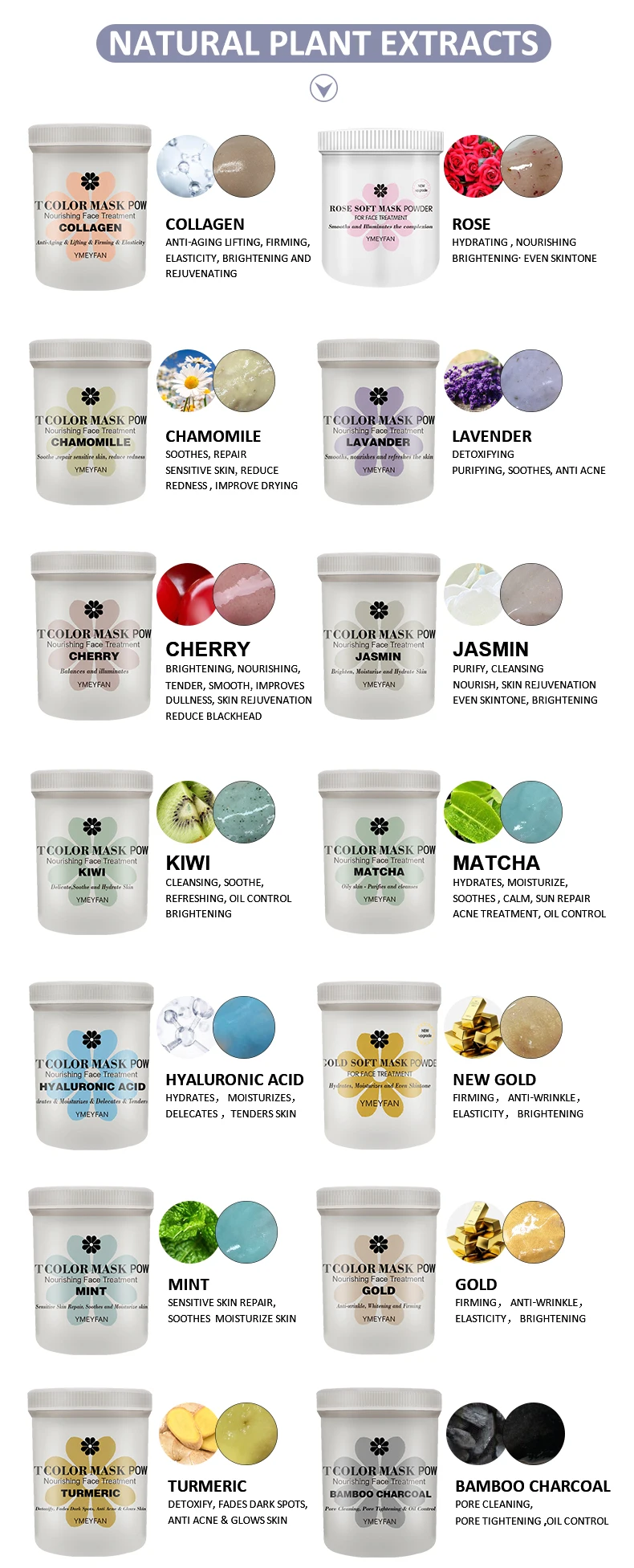 Он обладает хорошим противовоспалительным, анти-аллергическим, успокаивающим и терапевтическим действием. Этот порошок маски может улучшить сухую, грубую и тусклую кожу, охладить и успокоить кожу.