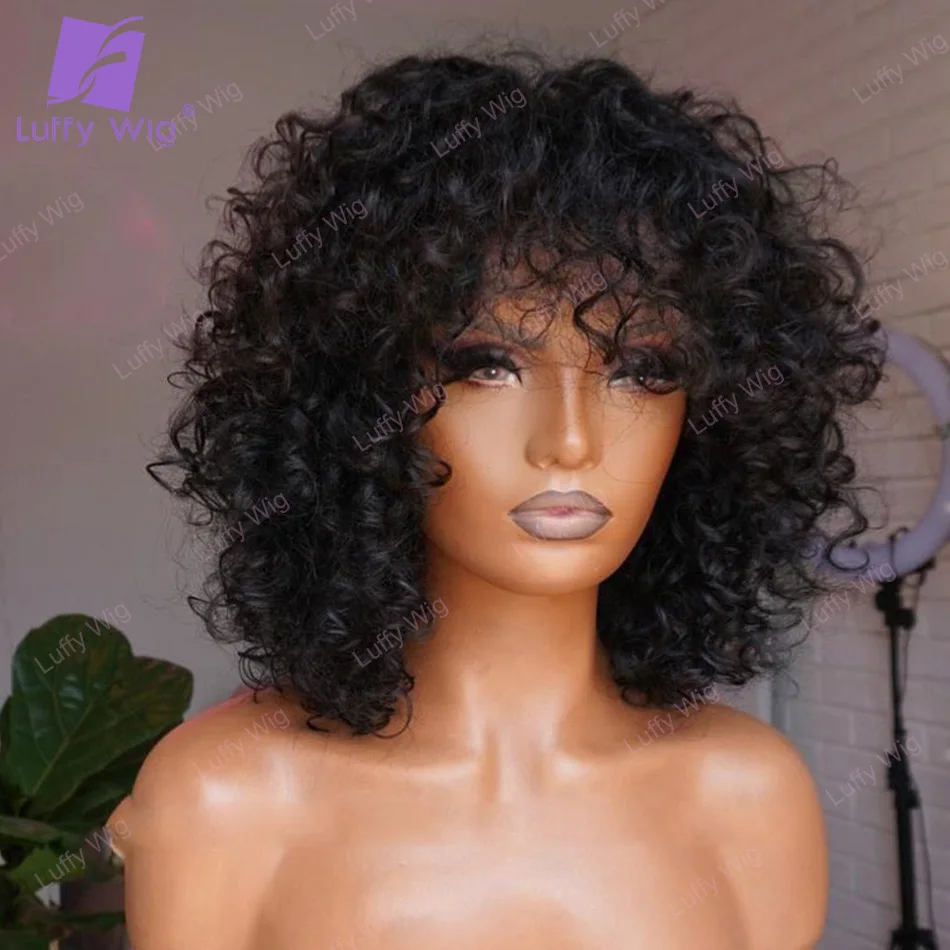 Короткий надувной парик из вьющихся человеческих волос с челкой, Remy бразильские волосы, волосы для головы, вьющиеся, Боб, парики без клея, 200 плотный парик, luffywig