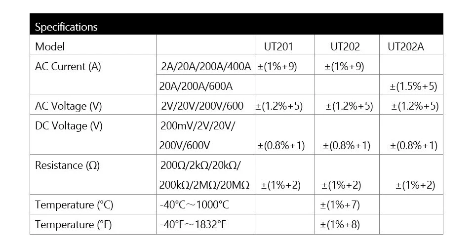 UT201 клещиЭта серия представляет собой цифровой зажим начального уровня UNI-T. Это отличный выбор для измерения жилого и коммерческого провода питания. UT202 и UT204A поставляются с точечным контактным температурным зондом, идеально подходит для работы в HVAC.1. Автоматический диапазон2. Хранение данных/Автоматическое отключение питания3. Максимальный режим4. 3 раза/с частота дискретизации5. Низкая батарея/индикация диапазона и автоматический дисплей полярности