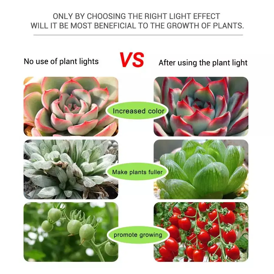 No use of plant lights VS After using the plant light A Increased color B Make plants fuller C promote growing
