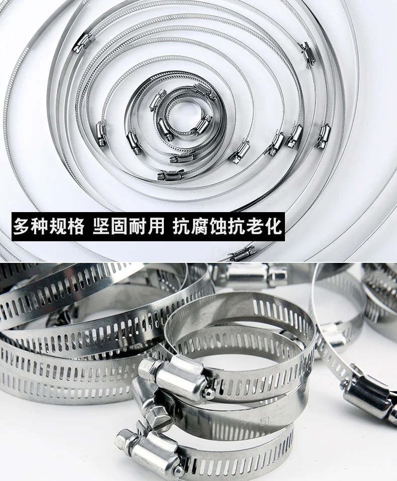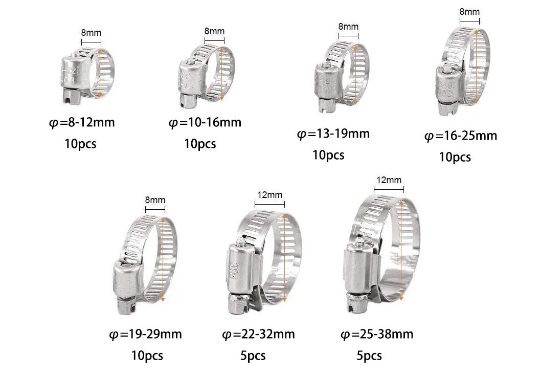 Спецификация:Материал: нержавеющая сталь 304 Посылка включает:8-12 мм/10 шт10-16 мм/10 шт13-19 мм/10 шт16-25 мм/10 шт19-29 мм/10 шт12-32 мм/5 шт25-38 мм/5 шт.Всего 60 шт.