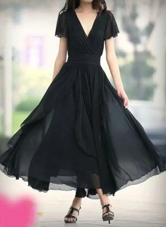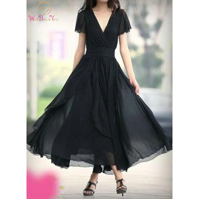 Черные вечерние шифоновые платья до щиколотки с коротким рукавом и V-образным вырезом, а-силуэт, с оборками, официальное платье для выпускного вечера, со складками