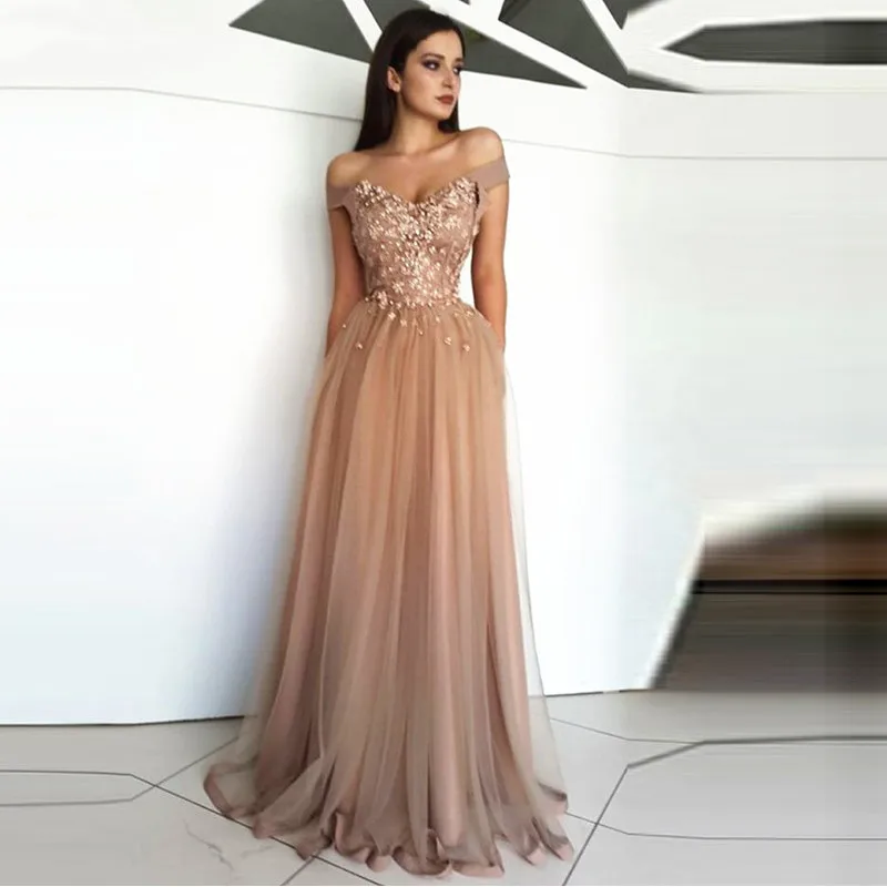 Платье для выпускного вечера Vkiss storeцвета шампанского с открытыми плечами, тюлевые кружевные цветы для вечеринки, длинное платье для выпускного вечера, вечерние платья, Халат