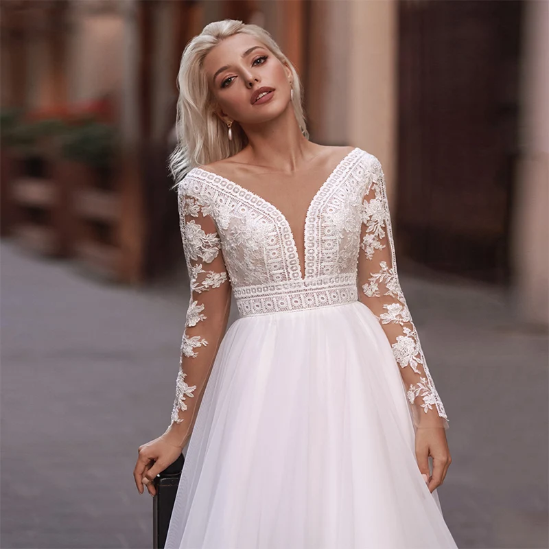 Свадебное платье в стиле бохо с глубоким V-образным вырезом и длинным рукавом, 2021, кружевные свадебные платья с аппликацией, Тюлевое свадебное платье до пола