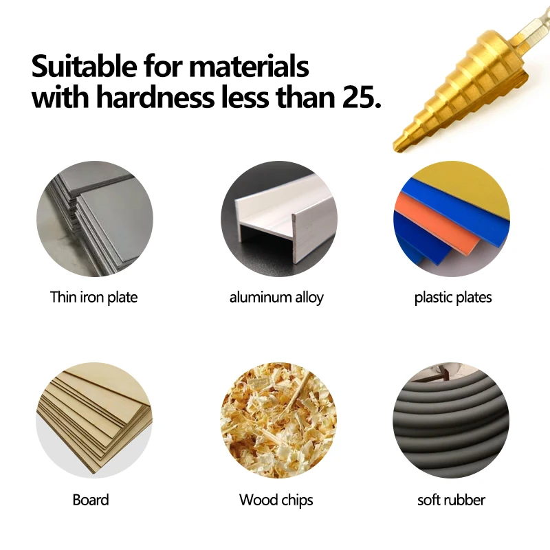 1 шт. 4-32 мм высокоскоростное стальное ступенчатое сверло с титановым покрытием для металла, дерева, сверла для сверления отверстий, деревообрабатывающие электроинструментыПримечание:Высокоскоростная сталь 4241 подходящий материал: подходит для деталей сТвердость менее 25, Тонкие железные пластины, алюминий, изоляционные пластины и ПВХ пластины. Толщина древесины составляет 5 мм. Сверло можно использовать для пробивки отверстий различных спецификаций.