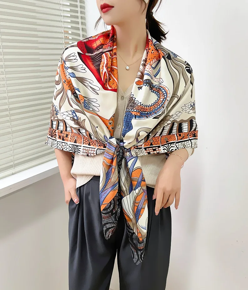 Размер изделия: 130 см X130 смЦвет изделия: как показано на картинкеИспользование продукта: многофункциональныйШелковый шарф имеет мягкую текстуру и приятный на ощупь.