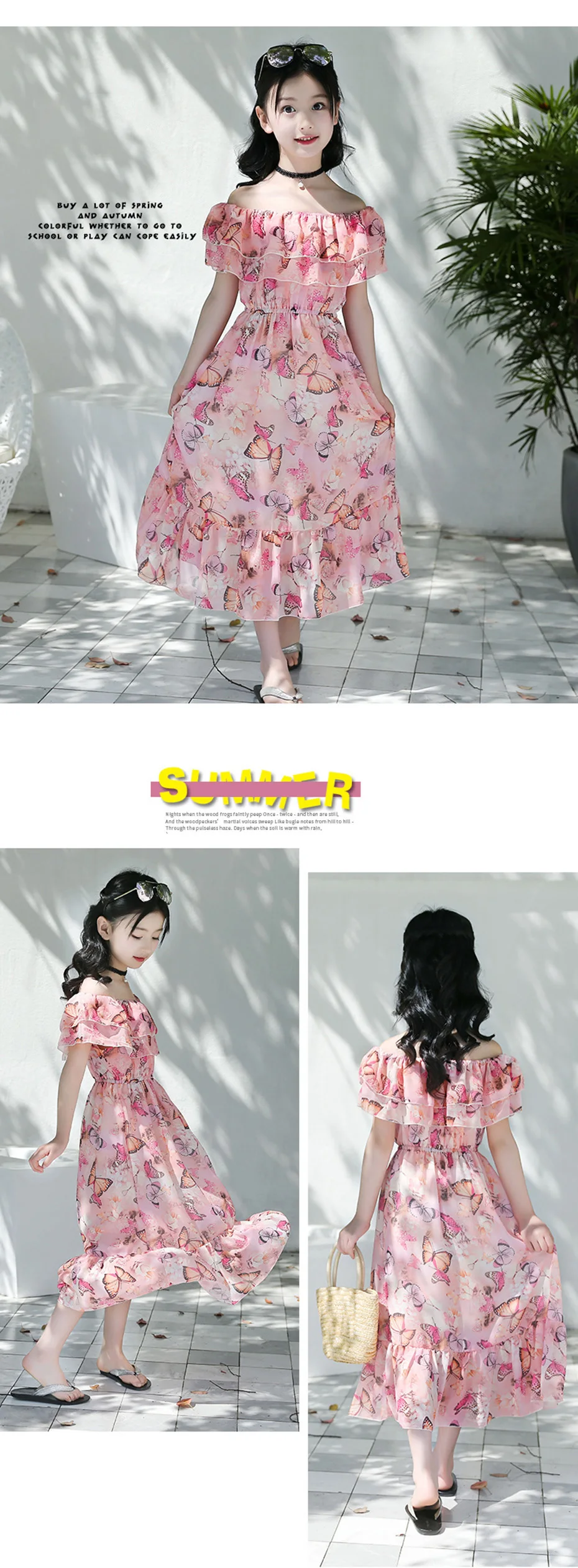 Летнее платье для девочек с цветочным принтом, пляжные платья для девочек, платье без плеча, детская одежда для подростков 6, 8, 10, 12, 14