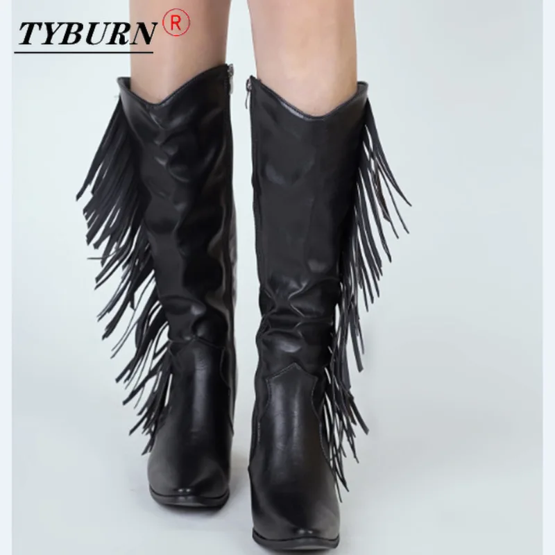 Новые женские винтажные сапоги с бахромой, сапоги до колена на низком массивном каблуке с острым носком, женские кожаные ковбойские сапоги в западном стиле для женщин