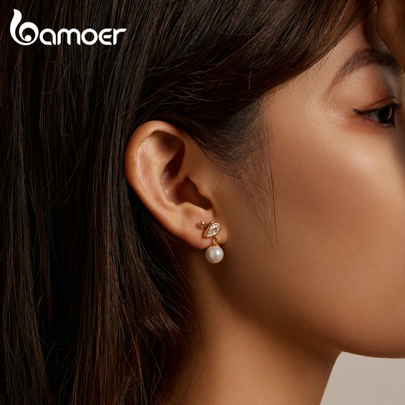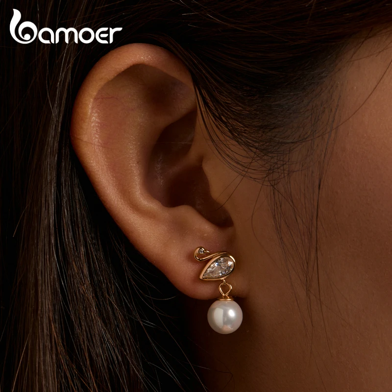 Женские серьги-подвески bamoer Geniune из стерлингового серебра 925 пробы с блестящим лебедем и жемчугом в виде ракушки, вечерние ювелирные изделия в Корейском стиле