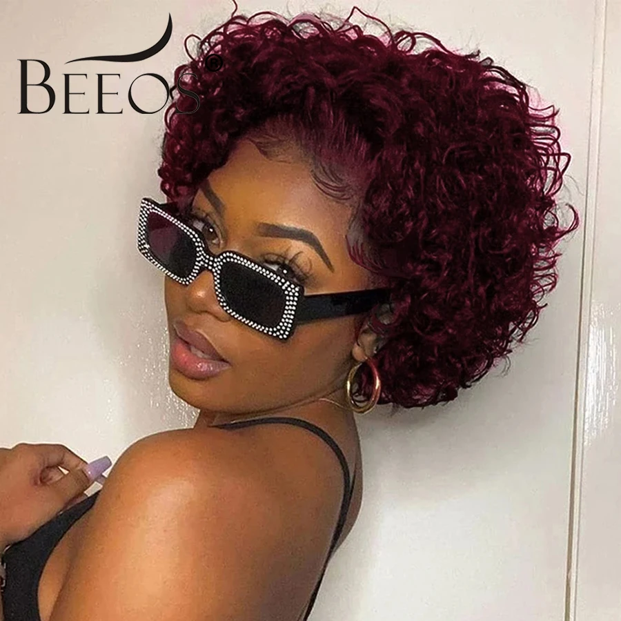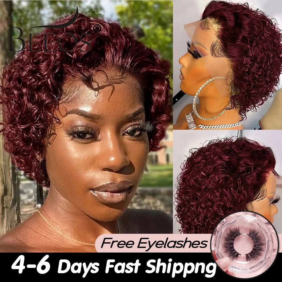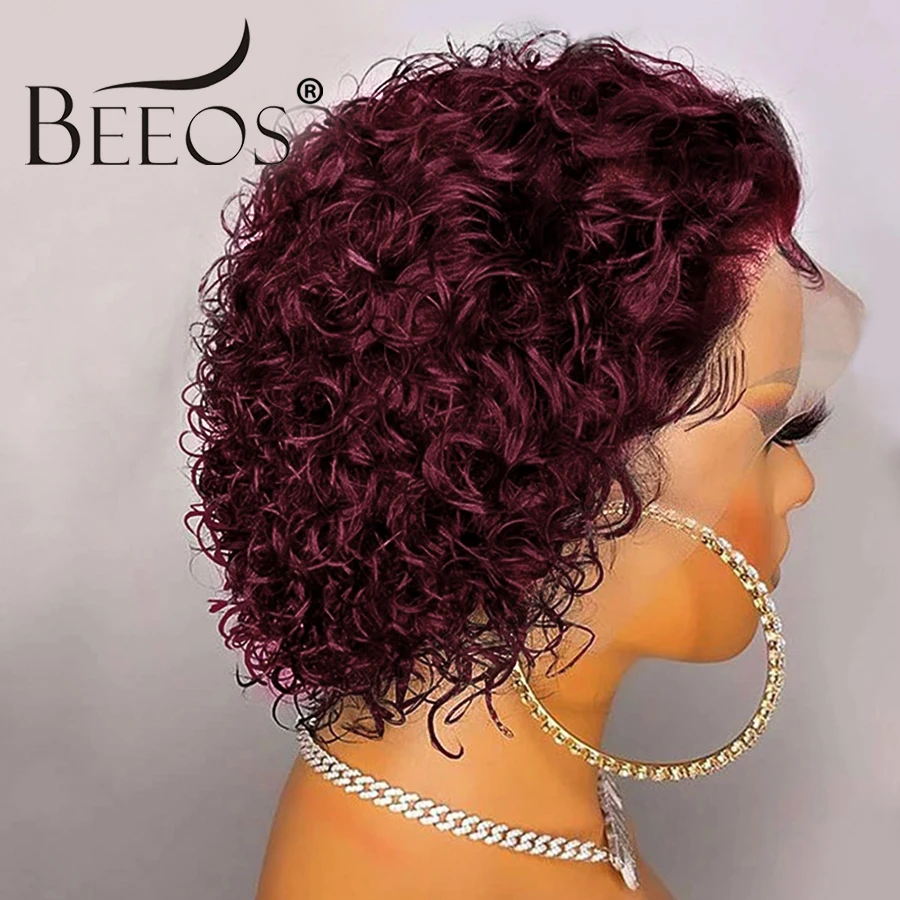 Beeos короткий Curly180 % Pixie Cut парик Бургундия 99J цветной 13*2 боб парик фронта шнурка человеческих волос парики бразильские Remy волосы предварительно сорванные