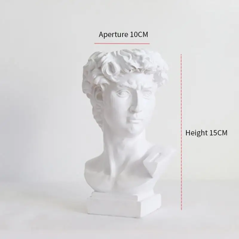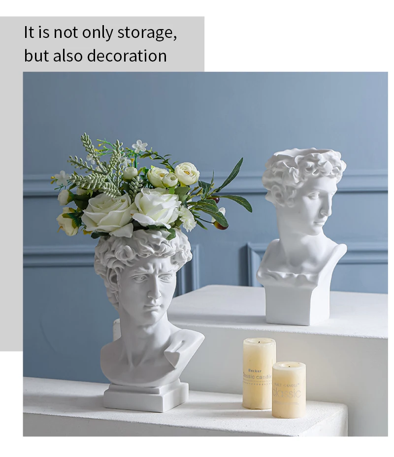 2. Многократное использование: Эта уникальная статуя Давида бюста, подставка для кистей для макияжа, может держать ваши кисти для макияжа, подводку для глаз, тушь для ресниц и аксессуары. Его также можно использовать как вазу, держатель ручки, суккулентный плантатор, комнатный/открытый плантатор, и украсить ваш обеденный стол, ванную комнату, столешницу и офис.