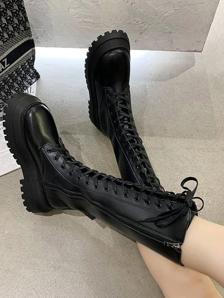 Женские сапоги до колена на массивной платформе, из искусственной кожи, на шнуровке