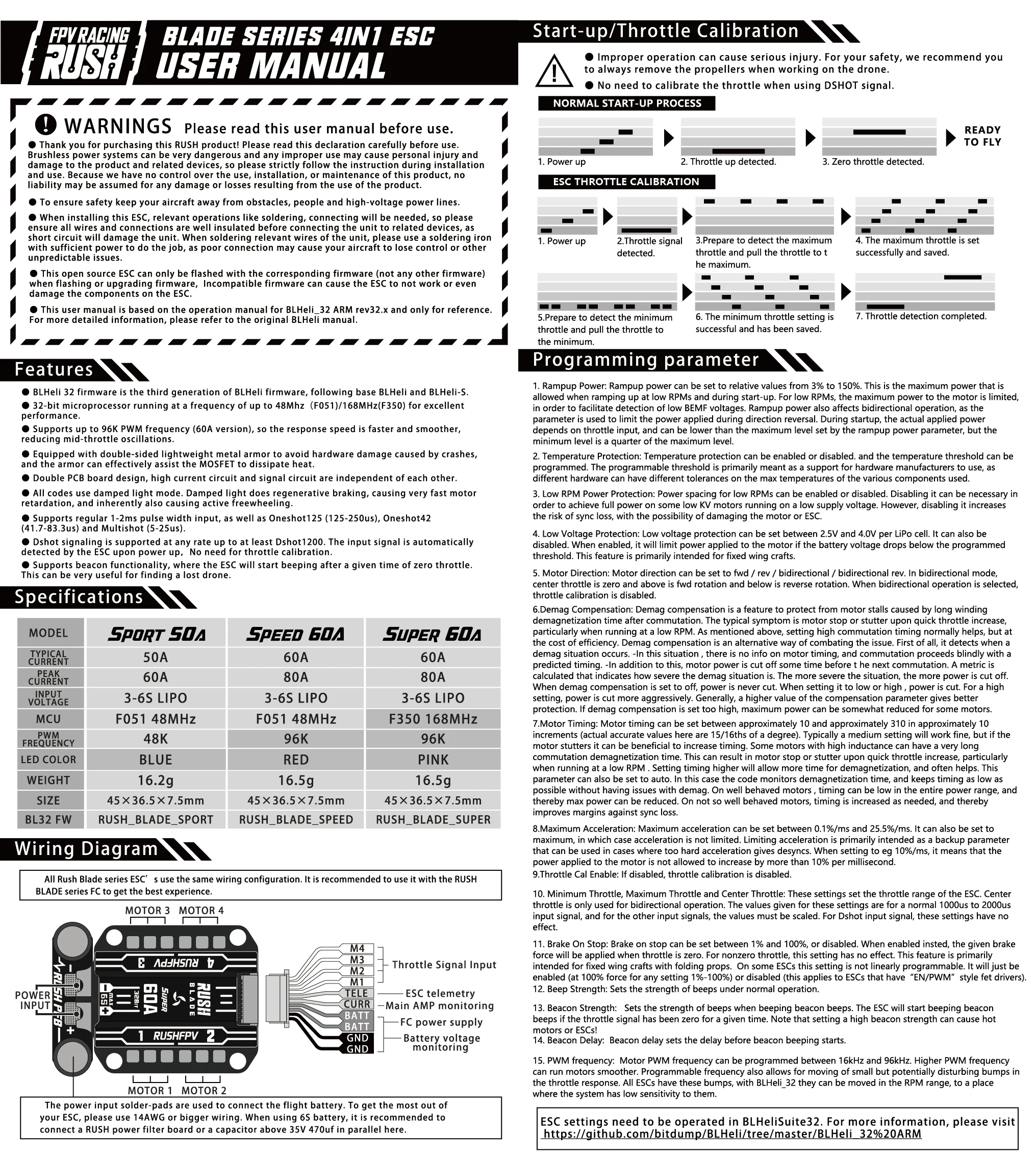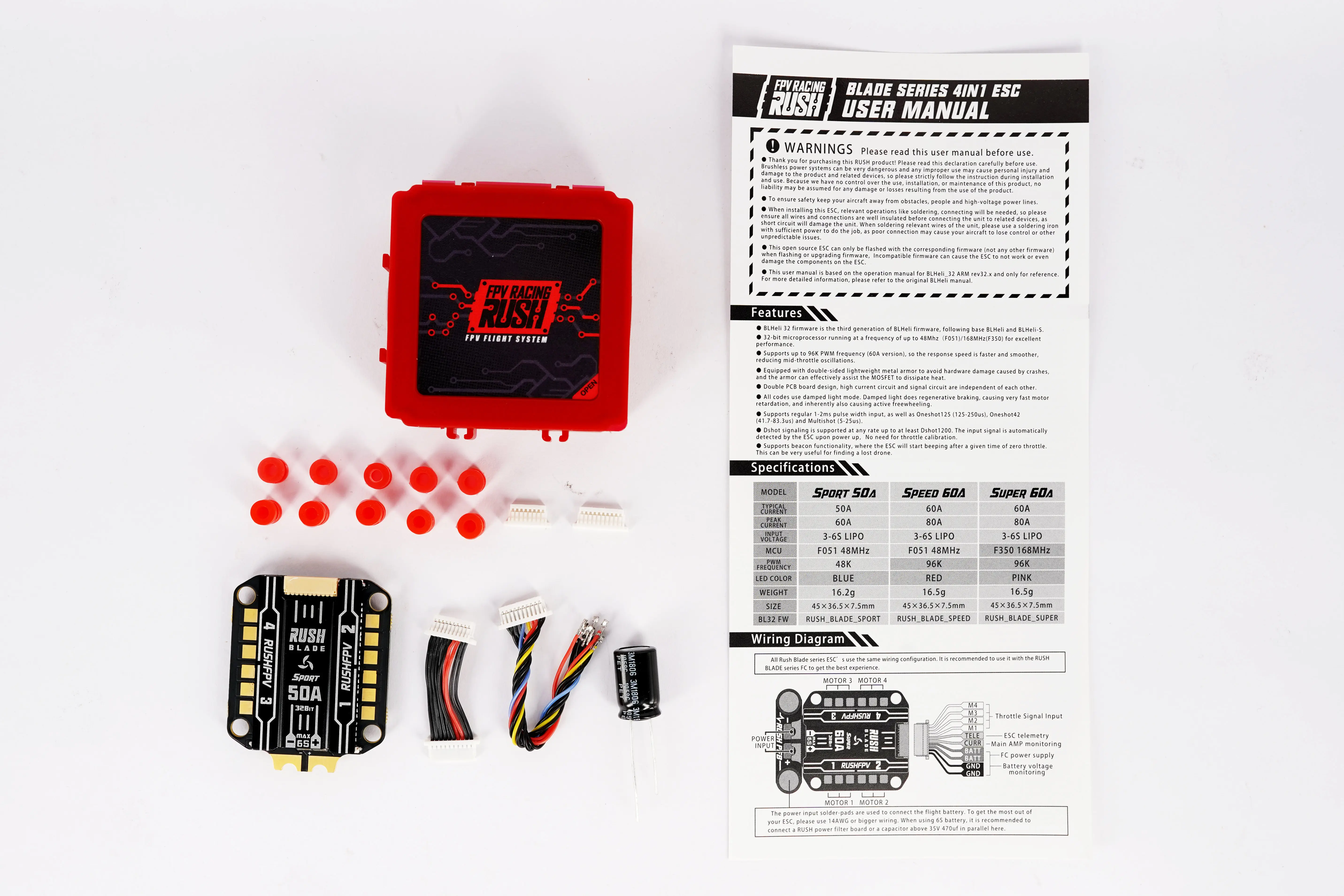 Спецификация:Бренд: RUSHFPVНаименование товара: серия BLADE 50A ESC SPORT EditionНоминальный ток: 50AПиковый ток: 60AВходное напряжение: 3-6S LipoMCU: F051 48 МГцШИМ: 48KСветодиодный Цвет: синийВерсия: BLHeli_32Размер: 45*36,5*7,5 ммВес: 16,2 гОсобенности:1. Полностью покрытый алюминиевый корпус, конструкция отличается прочностью и устойчивостью к взрыву и легко рассеивать тепло. Весь алюминиевый корпус весит всего 2,8 г.2. Двойная печатная плата, высокая токовая схема и сигнальная схема независимы друг от друга.3. 32-битный процессор работает стабильно на частоте до 48 МГц (F501)/168 МГц (F350).4. Поддерживает частоту PWM до 96K (версия 60A), поэтому скорость отклика быстрее и плавнее, уменьшая вибрацию дроссельной заслонки.5. Он принимает вставной дизайн для легкой установки.Посылка включает в себя:1 X RUSH BLADE 50A ESC SPORT Edition1 х квадратная коробка для храненияКабель 1X20 мм1X60 мм кабель2 х штепсельная вилка