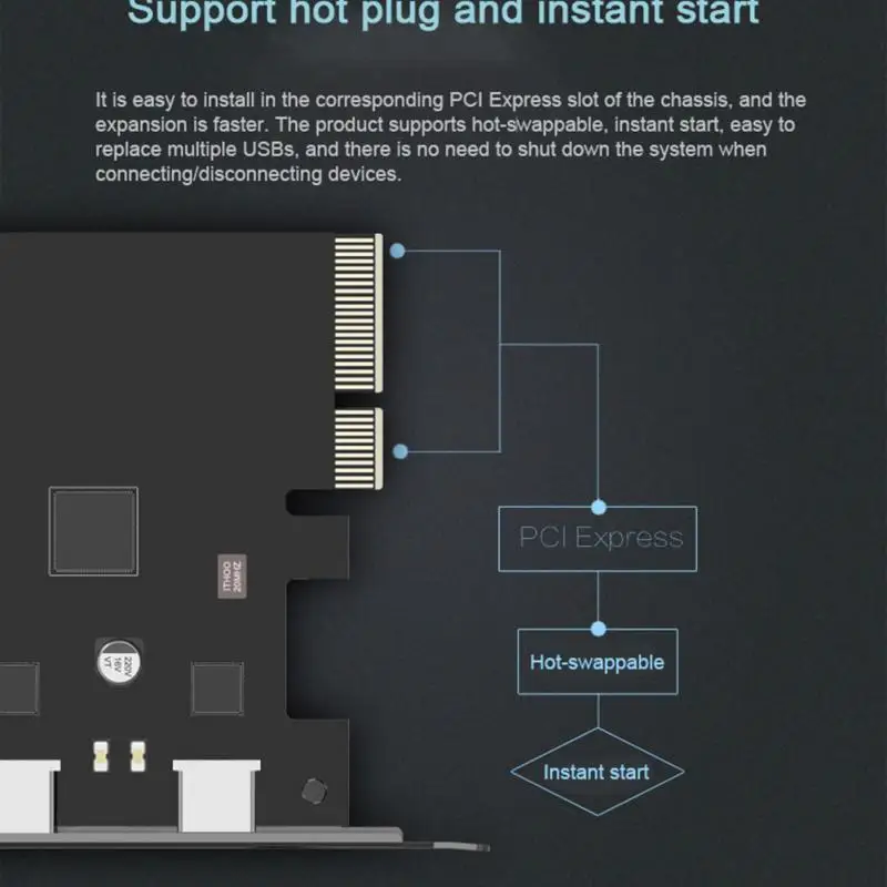 Его легко установить в соответствующий разъем PCI Express шасси, и расширение быстрее. Продукт поддерживает горячее переключение, мгновенный запуск, легко заменить несколько USBs, и нет необходимости отключать систему при подключении/отключении устройств.