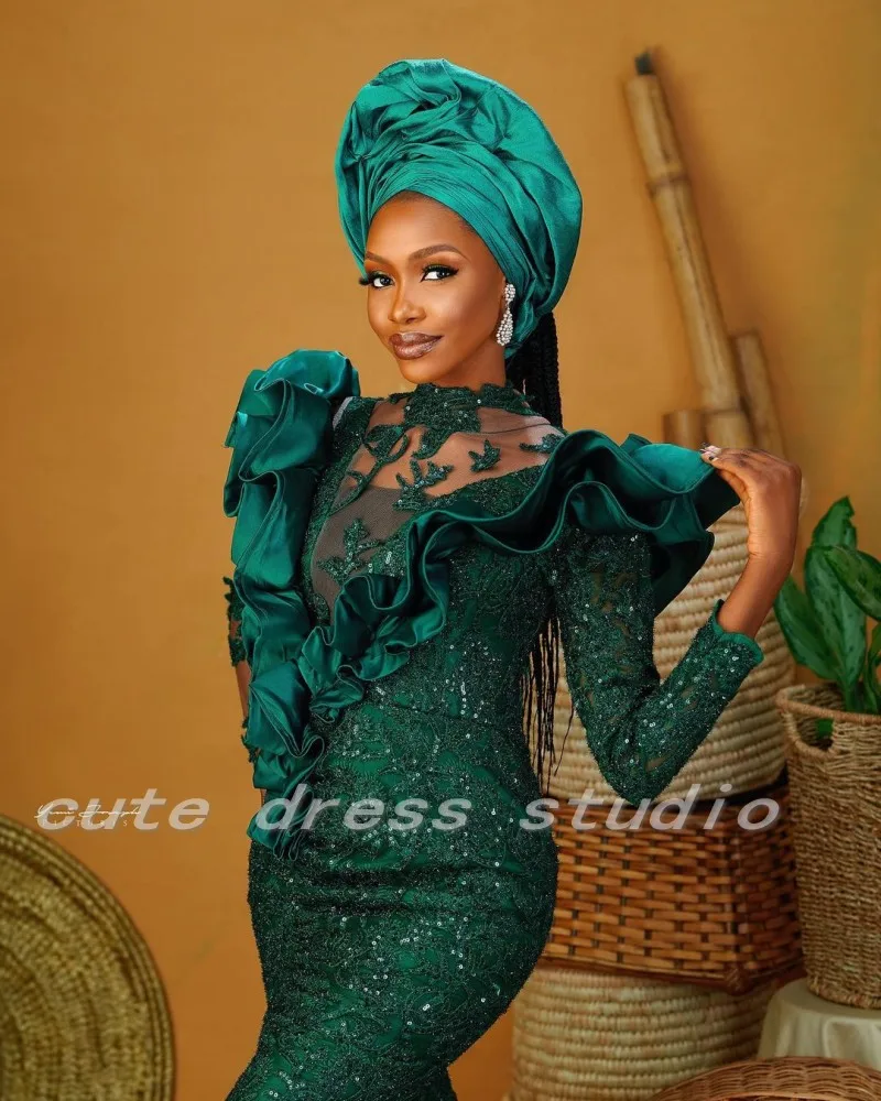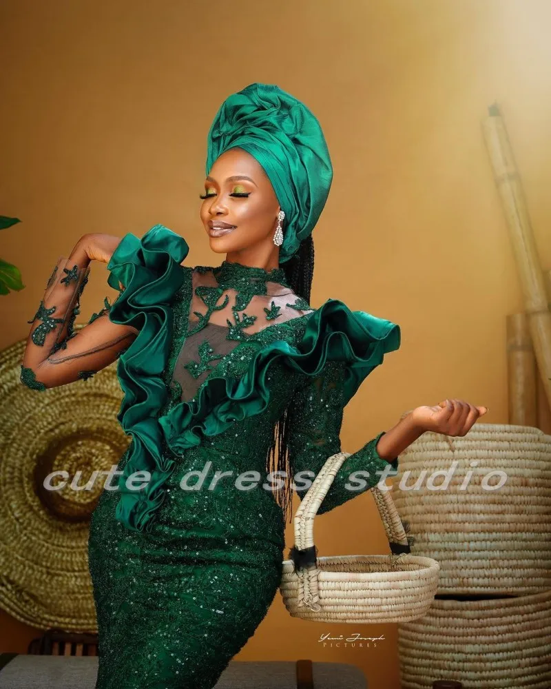 Индивидуализированные вечерние платья Aso Ebi с высоким воротником и длинными рукавами, кружевные нигерийские платья для выпускного вечера, стильные женские Вечерние наряды с блестками