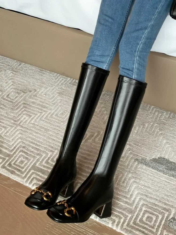 Женские сапоги до середины икры, черные и бежевые сапоги из искусственной кожи на квадратном каблуке, с металлическим украшением, 2022