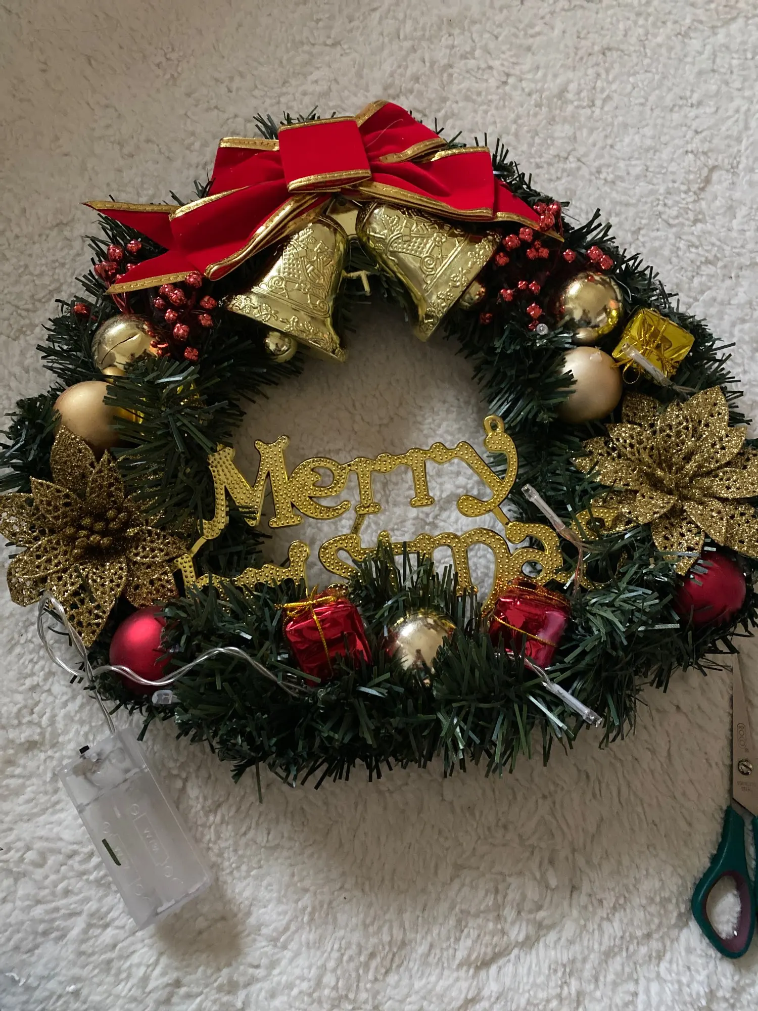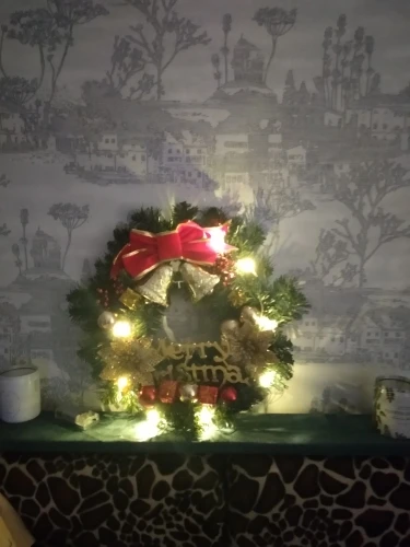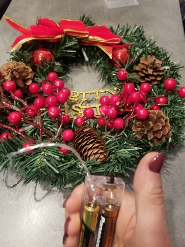 красивый венок, яркий, соответствует описанию. главное что пришел абсолютно целый без повреждений батарейки пальчиковые 2 шт. для гирлянды нужны свои. осталось только расправить иголочки на ветках и готово. ну еще немного сыпятся иголки .но это при работе с ним. когда будет висеть проблем не должно быть. пришел быстро. рекомендую.