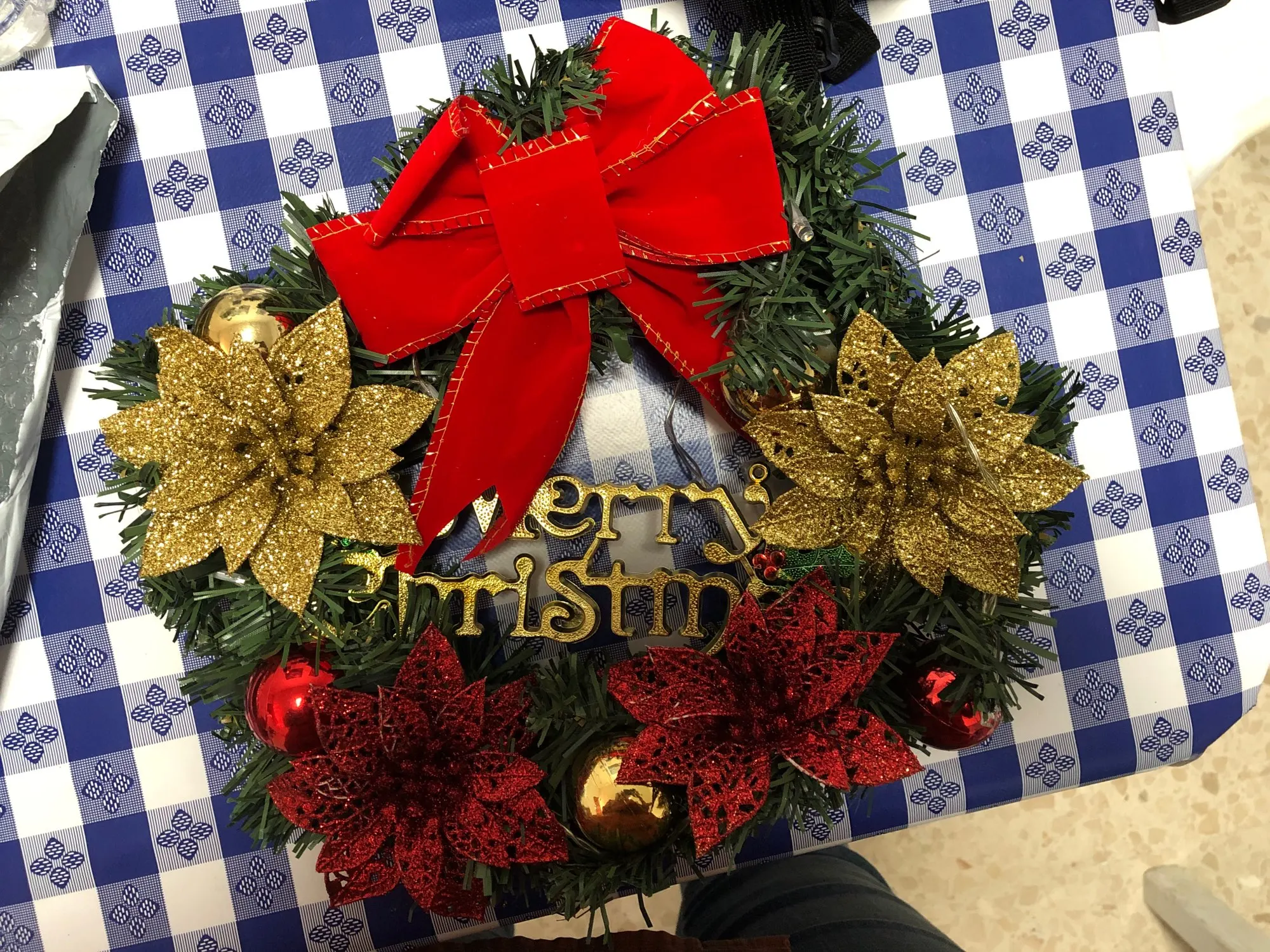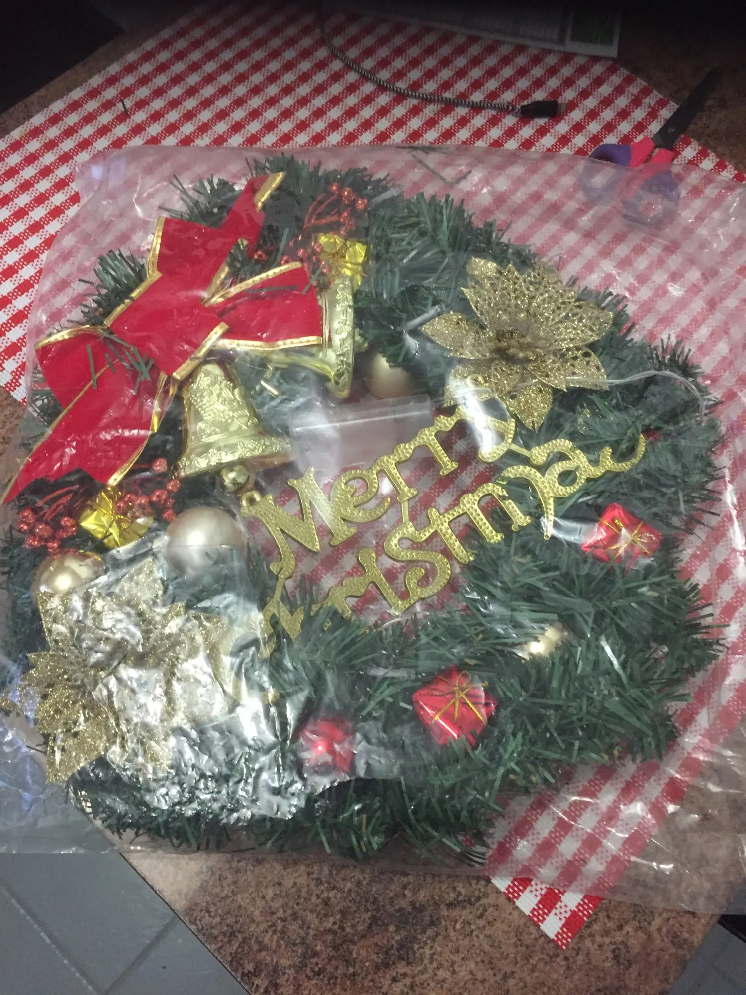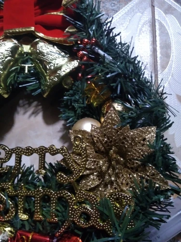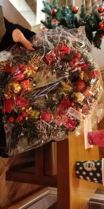 Венок выглядит дешево, и он не был упакован с осторожностью. Орнаменты раздавлены, а колокольчики соскальзывают с клея. Упаковка была в очень плоском пузырчатом пакете. Если вы можете это назвать.