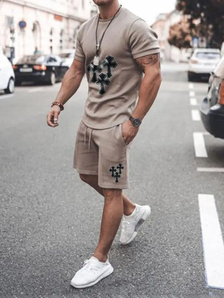 Модный мужской спортивный костюм из футболки и шортов, тренировочны...