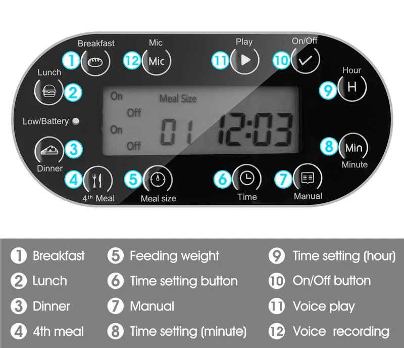 Программируемое время кормления-больше не просыпается домашними животными по утрам, не нужно беспокоиться о кормлении домашних животных, когда выходите! Автоматические кормушки для кошек могут обеспечить своевременное и количественное питание для ваших питомцев, 1-4-разовое питание в день, 1-4 0 порций в еде (5 мг в порции). Начните настраивать здоровую диету для ваших кошек и собак прямо сейчас!2-сторонний разветвитель & 304 Нержавеющая сталь тела-идеально подходит для мульти-питомец семьи. Этот Фидер для кошек 4,5л оснащен двухполосными разветвителями, перегородками, противозасорением конструкции, которые обеспечивают равномерное распределение между 2 чашами. Контейнер для хранения домашних животных и 2 миски изготовлены из нержавеющей стали 304, что обеспечивает более здоровую и гигиеническую еду для ваших питомцев.Двойная конструкция источника питания-даже если отключение питания, не беспокойтесь о том, что пищевой диспенсер для кошек не поставляет еду. Этот автоматический питатель для кошек питается от адаптера постоянного тока 5 В и/или батарей. Даже если питание питателя ПЭТ отключено, 3 Щелочные d-типа батареи будут держать оборудование в рабочем состоянии. Кроме того, он оснащен настройкой памяти, вам не нужно сбрасывать параметры после выключения питания.Диктофон 10s-вы можете позвонить своему питомцу перед едой! Нажмите кнопку «Mic» для автоматической подачи кошек, чтобы записывать голос 10s, регулярно вызывая вашего питомца, и пусть ваш голос будет сопровождать их каждый прием пищи. Вы также можете отменить запись, до еды не будет воспроизводиться голос.Простота и удобство в эксплуатации-простая установка/разборка + четкое Программирование позволяют начать работу за 5 минут. Легко моется и поддерживает посудомоечную машину-304 материал из нержавеющей стали прост в очистке, поддерживает автоматическая кормушка для кошки контейнеры для хранения пищи и 2 миски были вымыты в посудомоечной машине. (Примечание: Основной блок с дисплеем нельзя мыть)