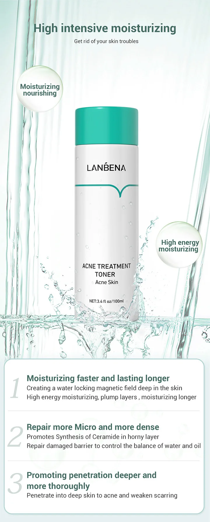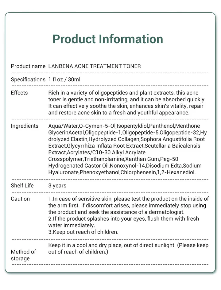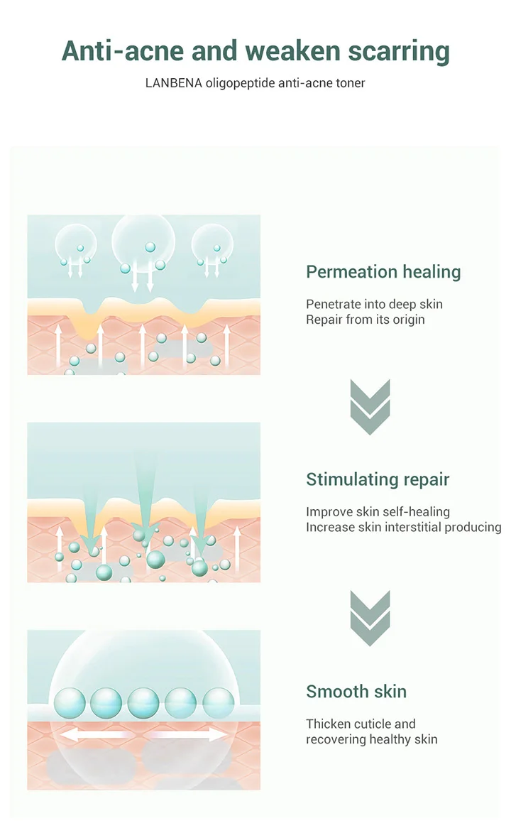 LANBENA oligopeptide anti-acne tonerPermeation healingPenetrate into deep skinRepair from its originStimulating repairImprove skin self-healingIncrease skin interstitial producingSmooth skinThicken cuticle and recovering healthy skin