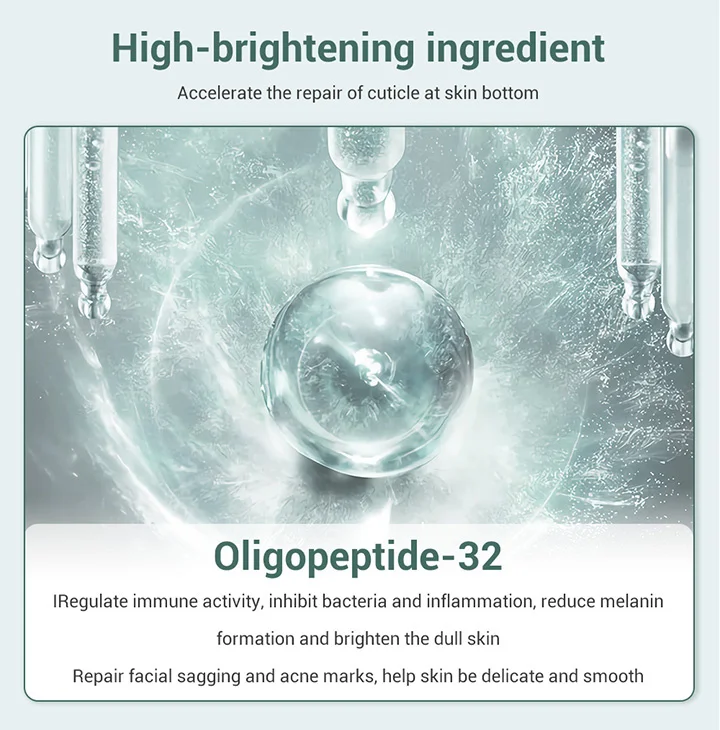 Accelerate the repair of cuticle at skin bottom Oligopeptide-32Regulate immune activity, inhibit bacteria and inflammation, reduce melanin formation and brighten the dull skinRepair facial sagging and acne marks, help skin be delicate and smooth
