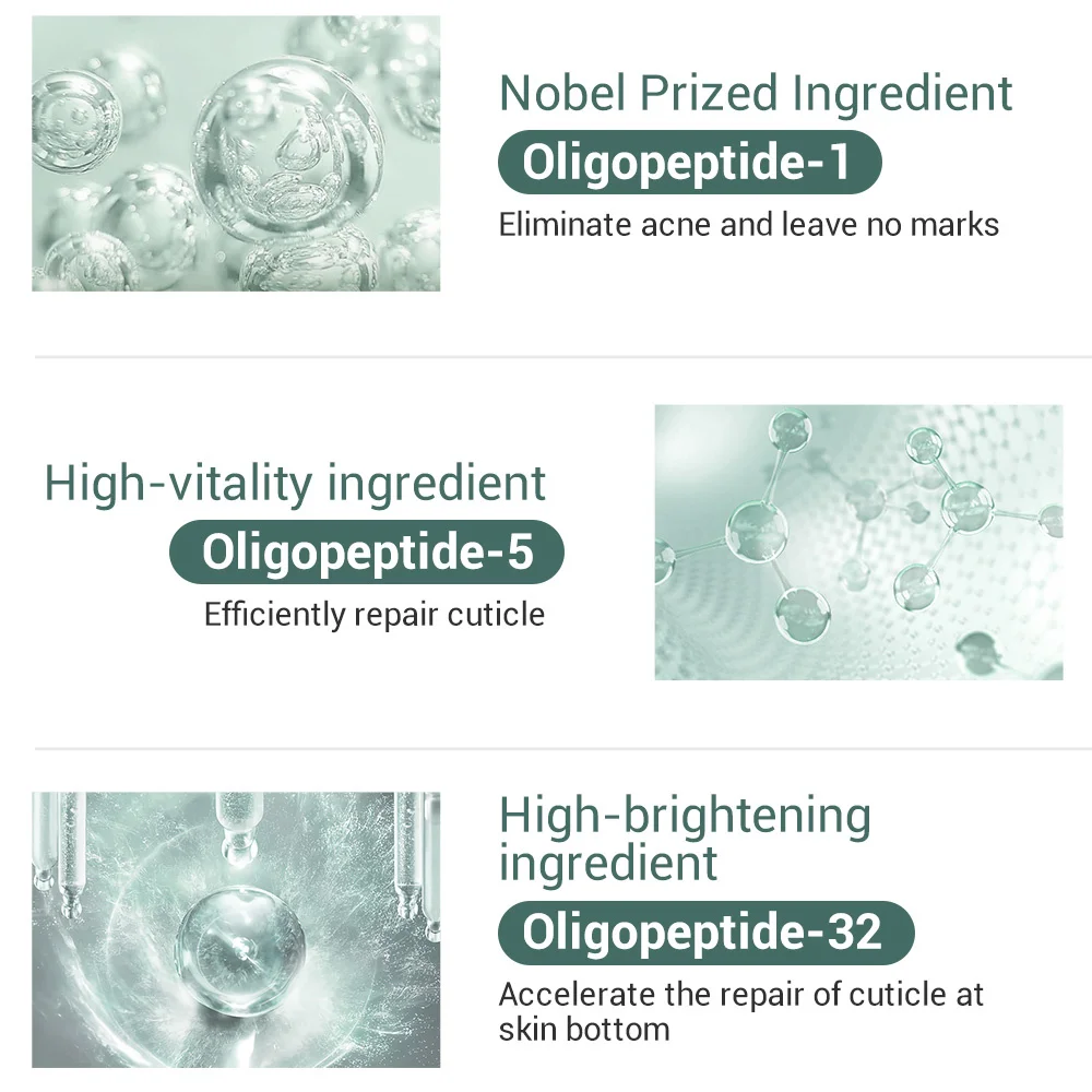 Get rid of your skin troubles1.Anti-acne weaken scarringOligopeptide-1, Relieve acne scarring2. Smooth fine linesOligopeptide-32, Improve the loose fine lines3. Clear moisturizingBalance of qater and oil, brighten the skin