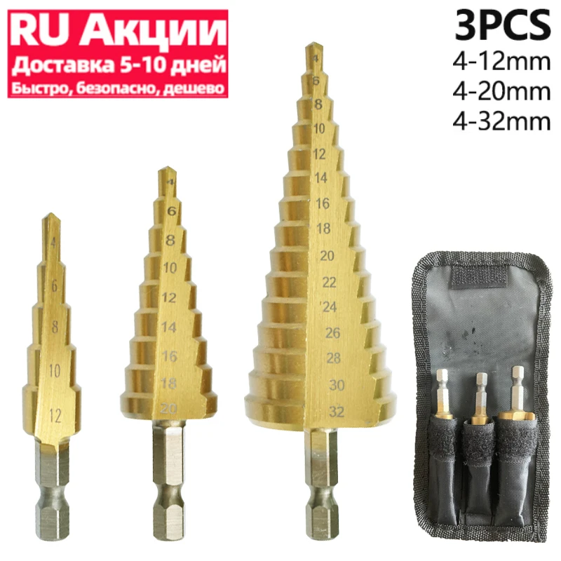 Ступенчатое сверло 3-12 мм, 4-12 мм, 4-20 мм, 4-32 мм