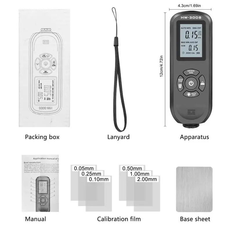 Толщиномер x 1 Руководство x 1 Калибровочный лист x 1