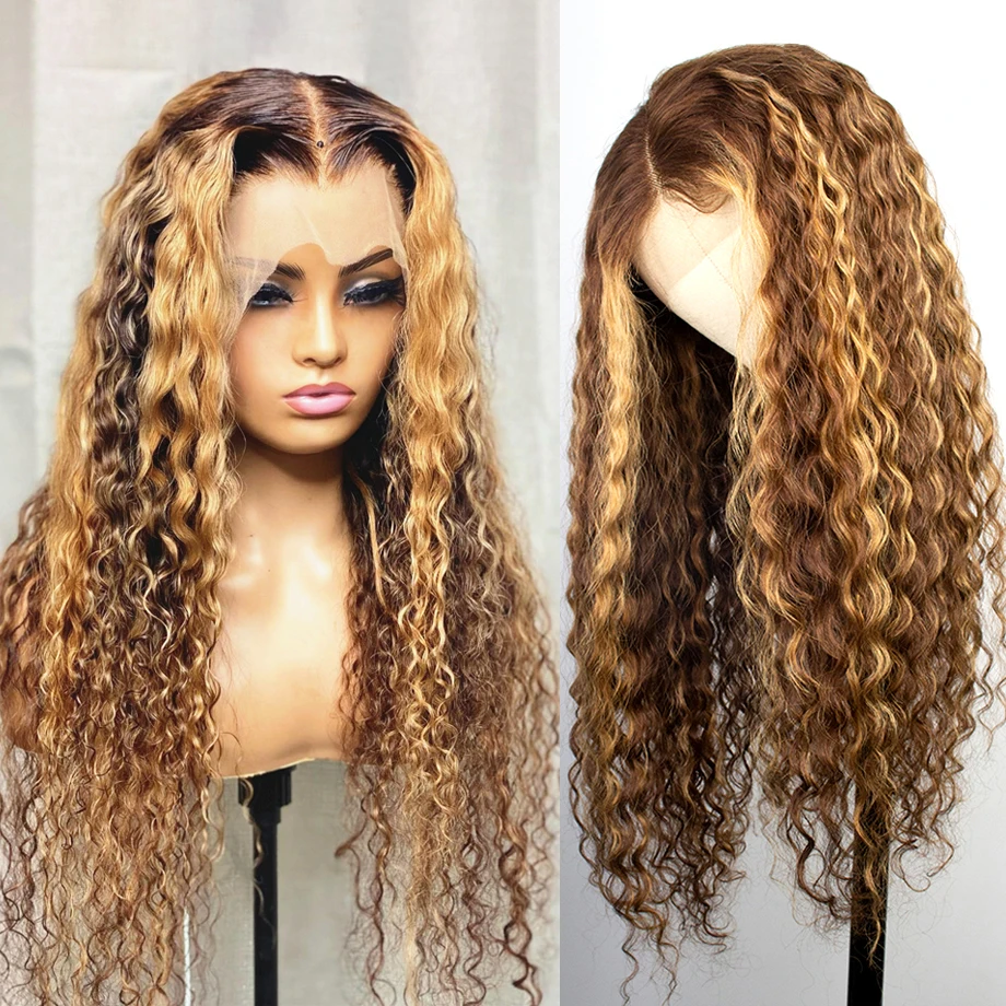 Парик кудрявый из человеческих волос, окрашенные бразильские волосы с эффектом омбре, с глубокой водной волной, фронтальные парики с Т-образной поверхностью, медовая блондинка, Боб, на сетке спереди