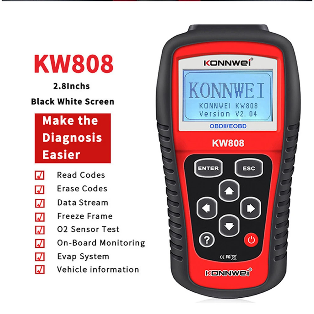 Модель продукта: KW808 автомобильный диагностический инструмент OBD 2 автоматический сканерРазмер изделия (см): 20*10*4Размер упаковки (см): 25,5*18,5*7Вес (кг): 0,72Особенности:Работает на всех 1996 и более поздних OBDII совместимых с США, европейскими и азиатскими автомобилямиЛегко определяет причину проверки двигателя светильник (MIL)Извлечение общих (P0, P2, P3 и U0) и конкретных кодов производителя (P1, P3 и U1)Отключает контрольный светильник двигателя (MIL), очищает коды и сброс мониторовОтображает определения DTC на экране устройстваПросмотр данных рамки замораживанияОтображает состояние готовности монитора и I/M (выбросов)Определение ожидаемых кодовЧитает live PCM datastreamОтображает данные тестирования датчика O2 в реальном времениДиаграммы данных C (1996 и более новые)Чтение, хранение и воспроизведение данных датчика в режиме реального времениРезервное копирование памяти/батареи для обзора и анализа данных вне транспортного средстваМногоязычное меню: --- английский, испанский, французский, немецкийВыполняет испытания модулейПолучение информации о транспортном средстве (VIN, CIN и CVN)Поддержка CAN (контроллер сети) и всех других токовПротоколы OBD-IIВстроенная OBD-II библиотека поиска DTCБольшой легко читаемый ЖК-экран с подсветкойРаботает со следующим:Покрытие OBDII/EOBD (США, Азия и Европа) считывает и очищает общие и некоторые коды неисправностей maunfactures.