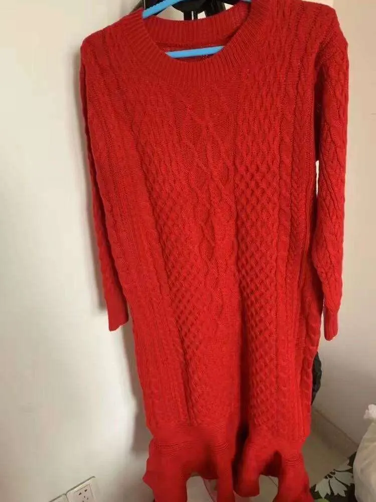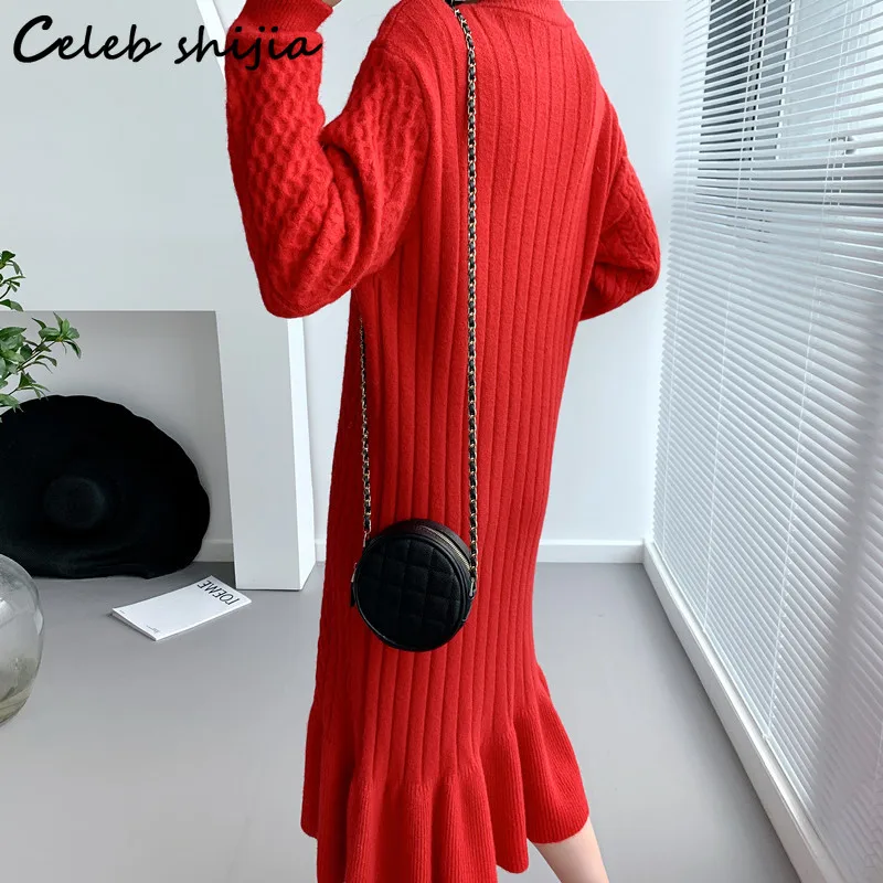 Женское вязаное платье-свитер с юбкой-годе, Красное Длинное свободное платье-свитер с круглым вырезом, элегантная шерстяная одежда в Корейском стиле на осень и зиму 2021