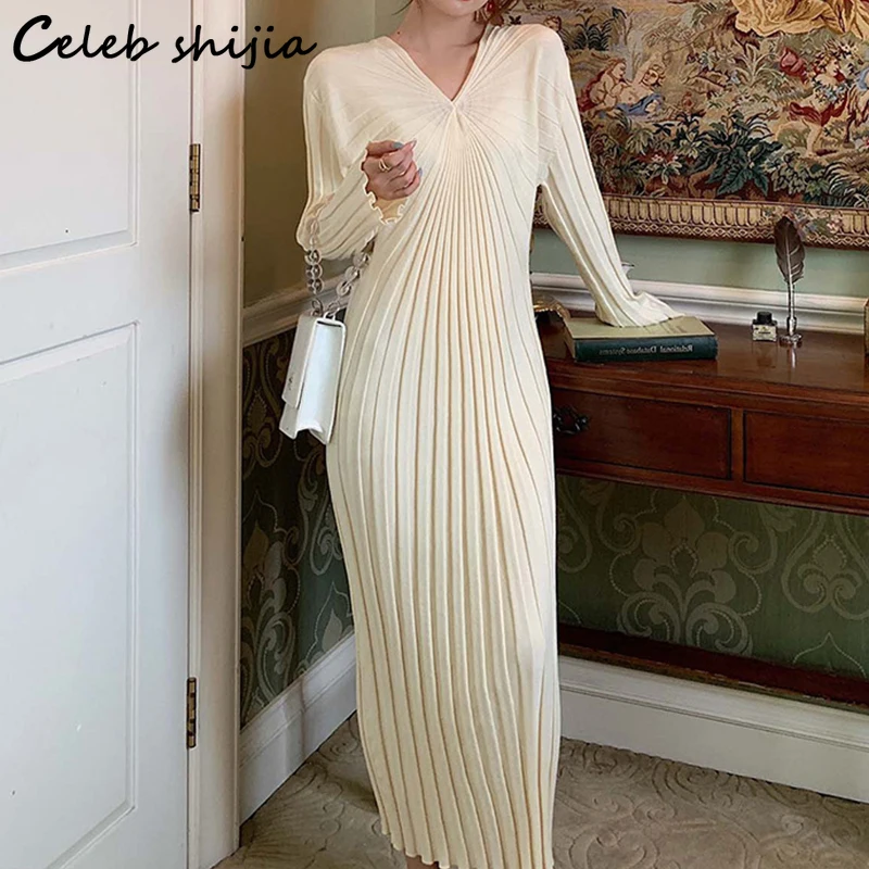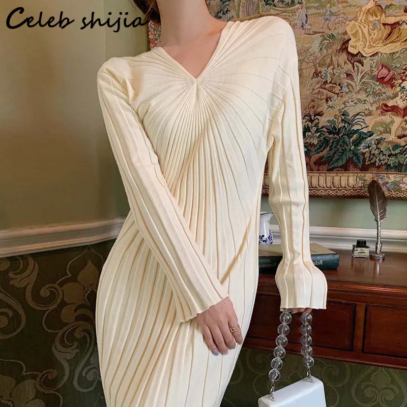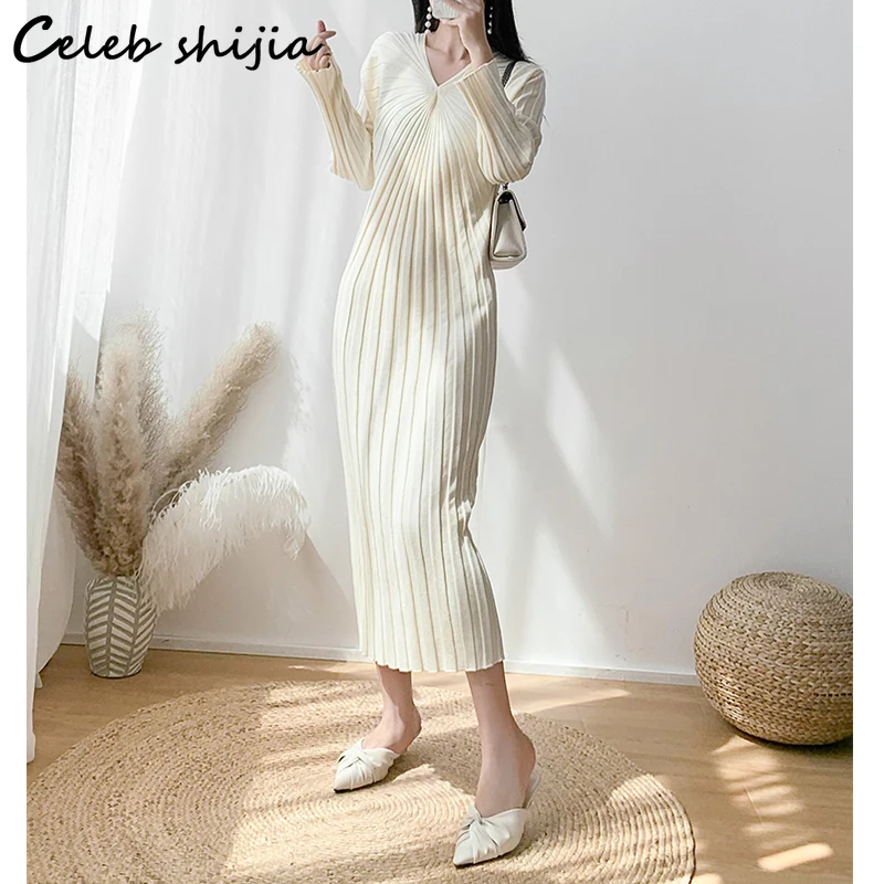 Осеннее вязаное платье с V-образным вырезом, Женское зимнее длинное...