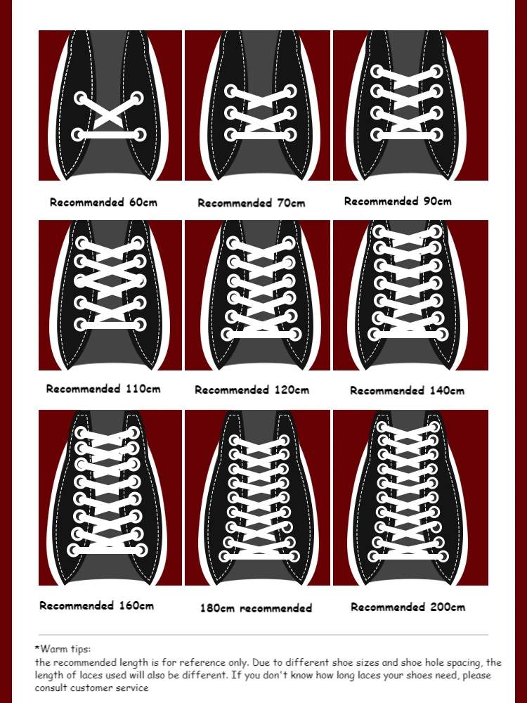 * Посылка включает в себя: одна пара шнурков + OPP упаковка,* О цвете: Пожалуйста, имейте в виду, прежде чем вы предлагаете цену, когда вы выбираете цвет, пожалуйста, с учетом этого изображения.* Допускается небольшая погрешность в размере из-за ручного измерения (1-3 см).