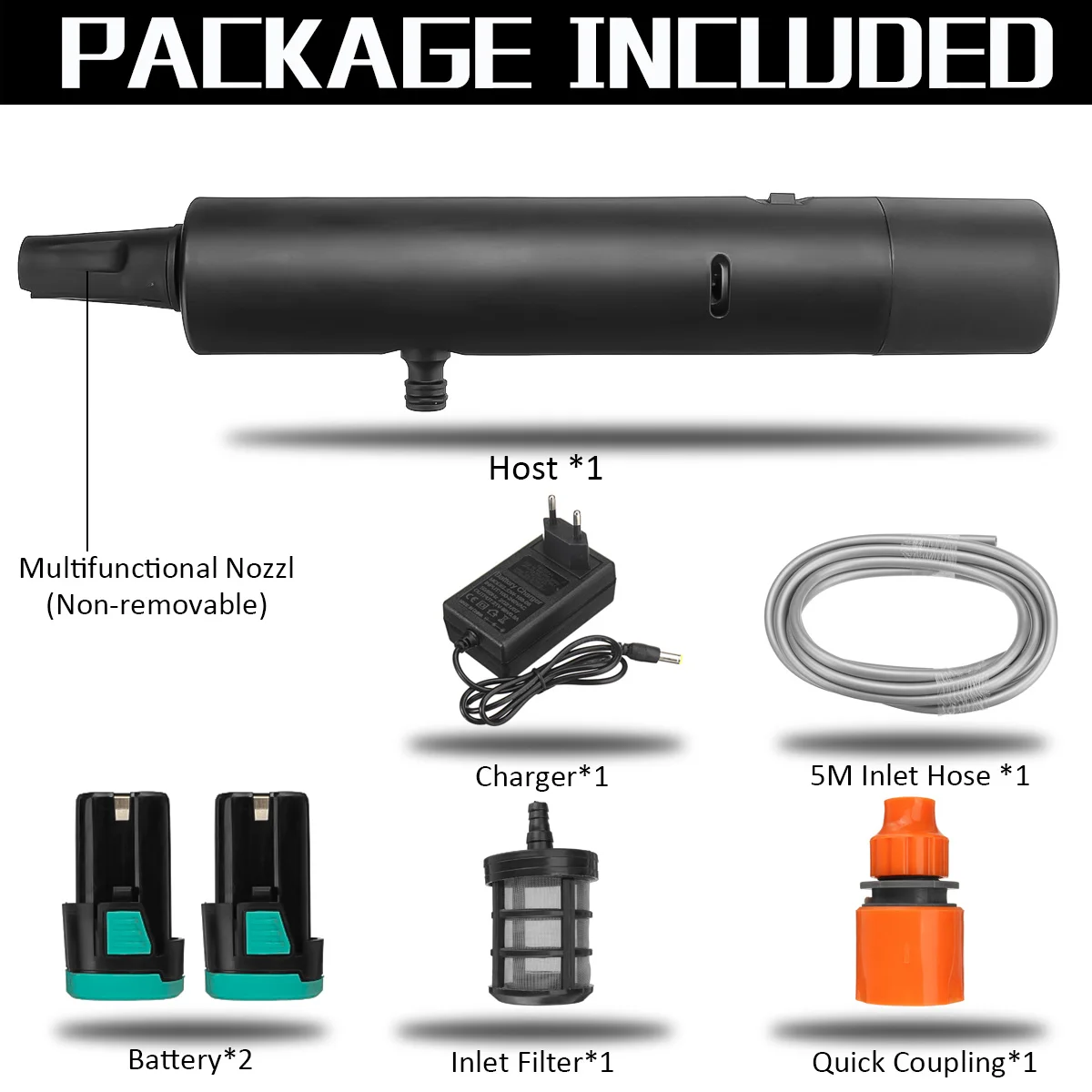 Высокое давление Беспроводная шайба распылительная шайба очиститель водыСпецификация:Мощность: 1000 ВтДавление Продукта: 50 барЕмкость аккумулятора: 10000 мАчРасход воды: 4 л/минДлина выходной трубы: 5 мЗарядное устройство Напряжение: AC 100-240V 50/60HzОпциональный узор: 1 комплект батарей/2 комплекта батарейОсобенности:-Гибкое использование, легко чистить.-Легкий и удобный, длительный срок службы батареи.-Многофункциональное сопло, переключающее форму воды по желанию.-Вы можете очистить в любом месте, где есть вода, в том числе с помощью ведра, бутылки, потока или бассейна.-Нержавеющая сталь тонкой сетки, и он имеет высокую эффективность и глубокой фильтрации, глубокий двойной фильтрации примесей в воде, долгий срок службы Защитная помпа.Посылка включает в себя:Рисунок 1:1 х Портативный очиститель давленияАккумулятор-1 шт.Зарядное устройство-1 шт.1 х 5 м впускной шланг1 х входной фильтр1 x быстрое соединениеРисунок 2:1 х Портативный очиститель давления2 батареиЗарядное устройство-1 шт.1 х 5 м впускной шланг1 х входной фильтр1 x быстрое соединениеПримечания:1. Ручное измерение, пожалуйста, учитывайте погрешность в 1-3 см, спасибо.2. Пожалуйста, оставьте нам сообщение о выбранном Вами количестве батареи, иначе мы отправим товар случайным образом.3. Из-за разницы между различными мониторами изображение может не отражать фактический цвет изделия. Мы гарантируем, что стиль такой же, как показано на фотографиях. Пожалуйста, поймите, спасибо!