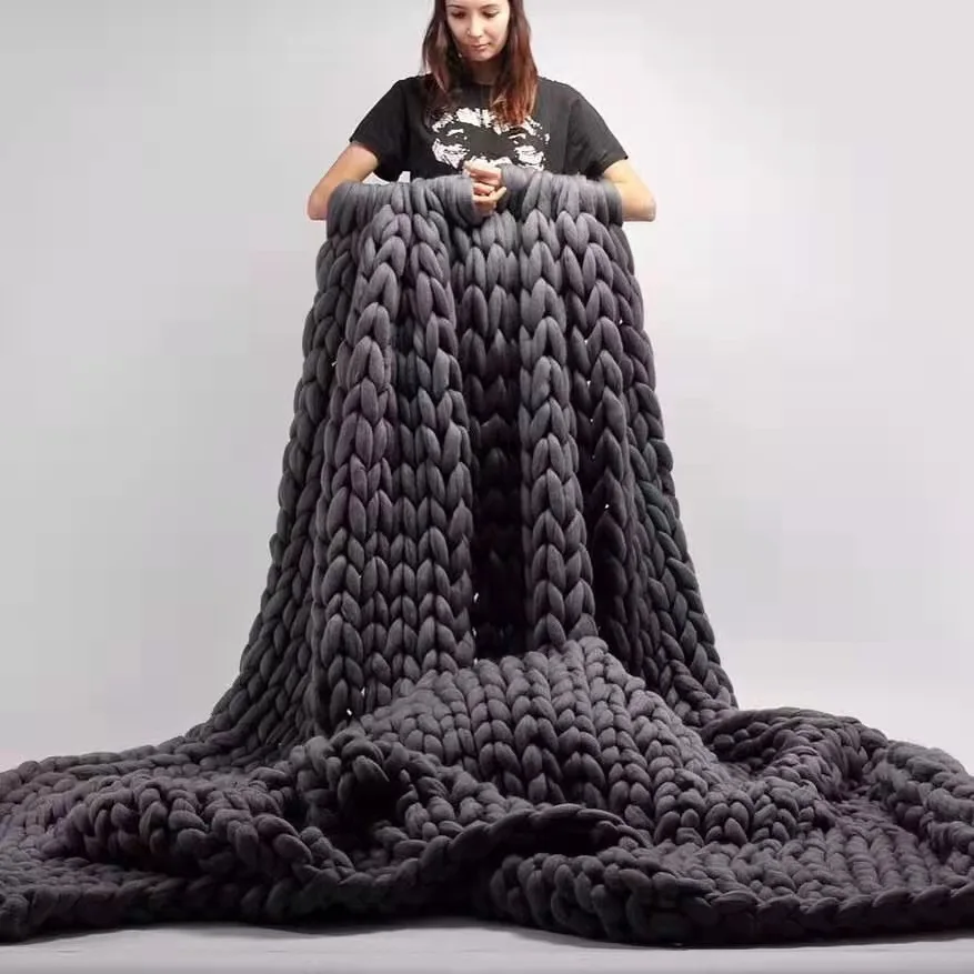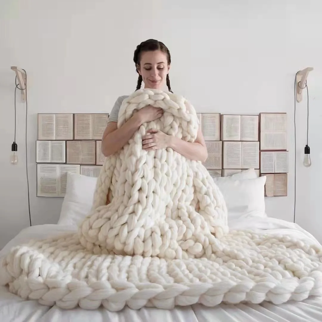 Вязаное одеяло ручной работы, толстая пряжа из мериносовой шерсти, ...