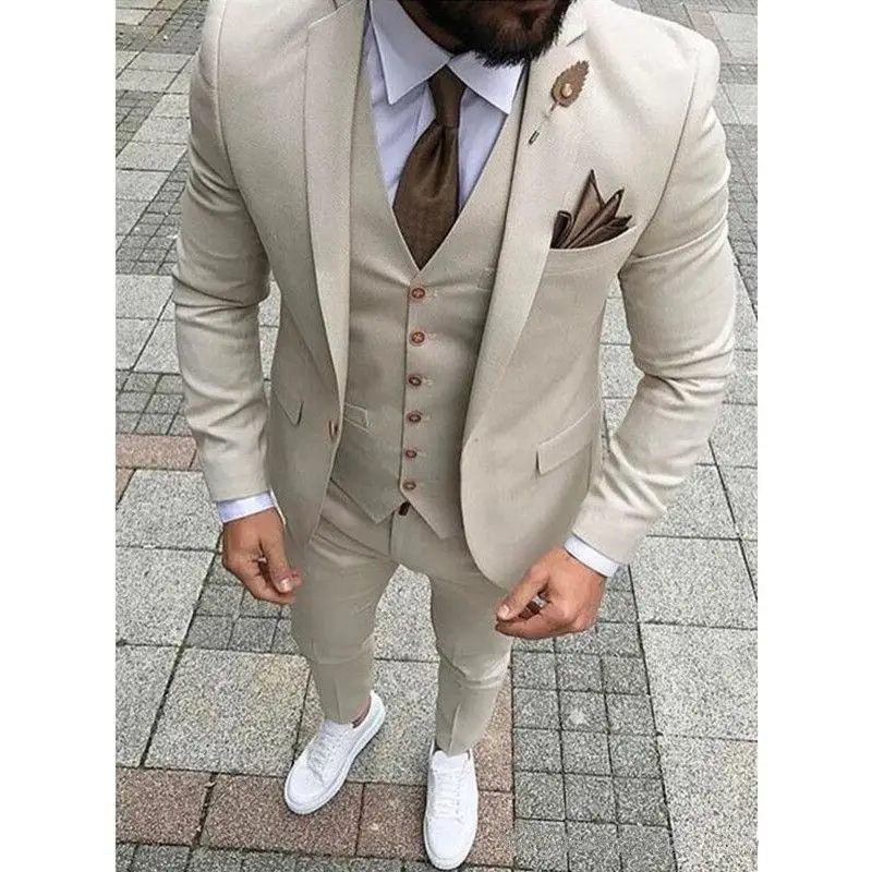Новые Бежевые смокинг для жениха с двумя пуговицами и вырезом на лацканеСвадебный мужской костюм брикет (пиджак + брюки + галстук + жилет) мужской костюм