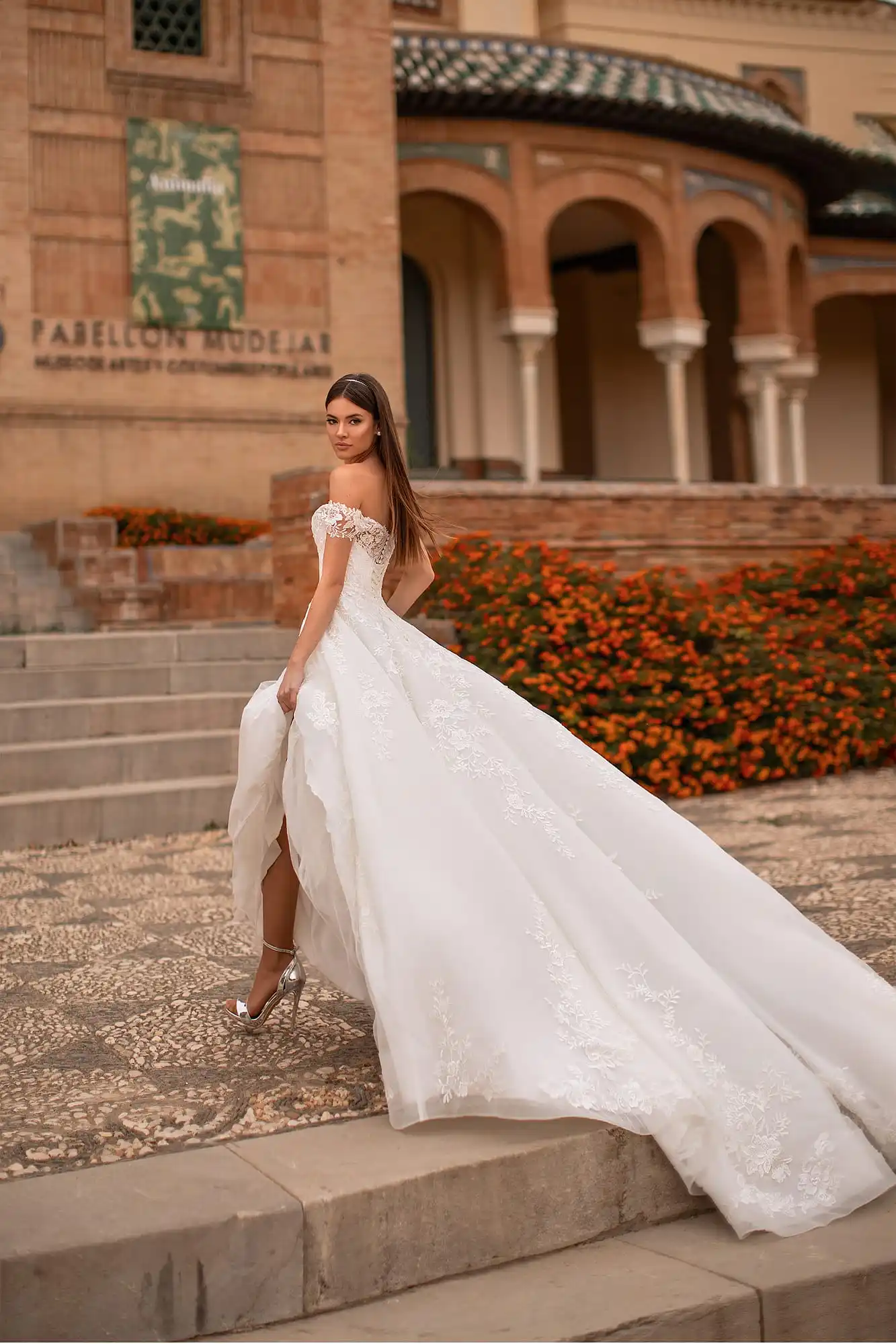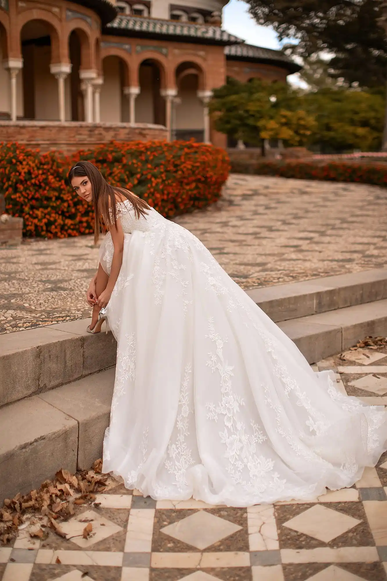 Свадебное платье с открытыми плечами и кружевной аппликацией, темно...