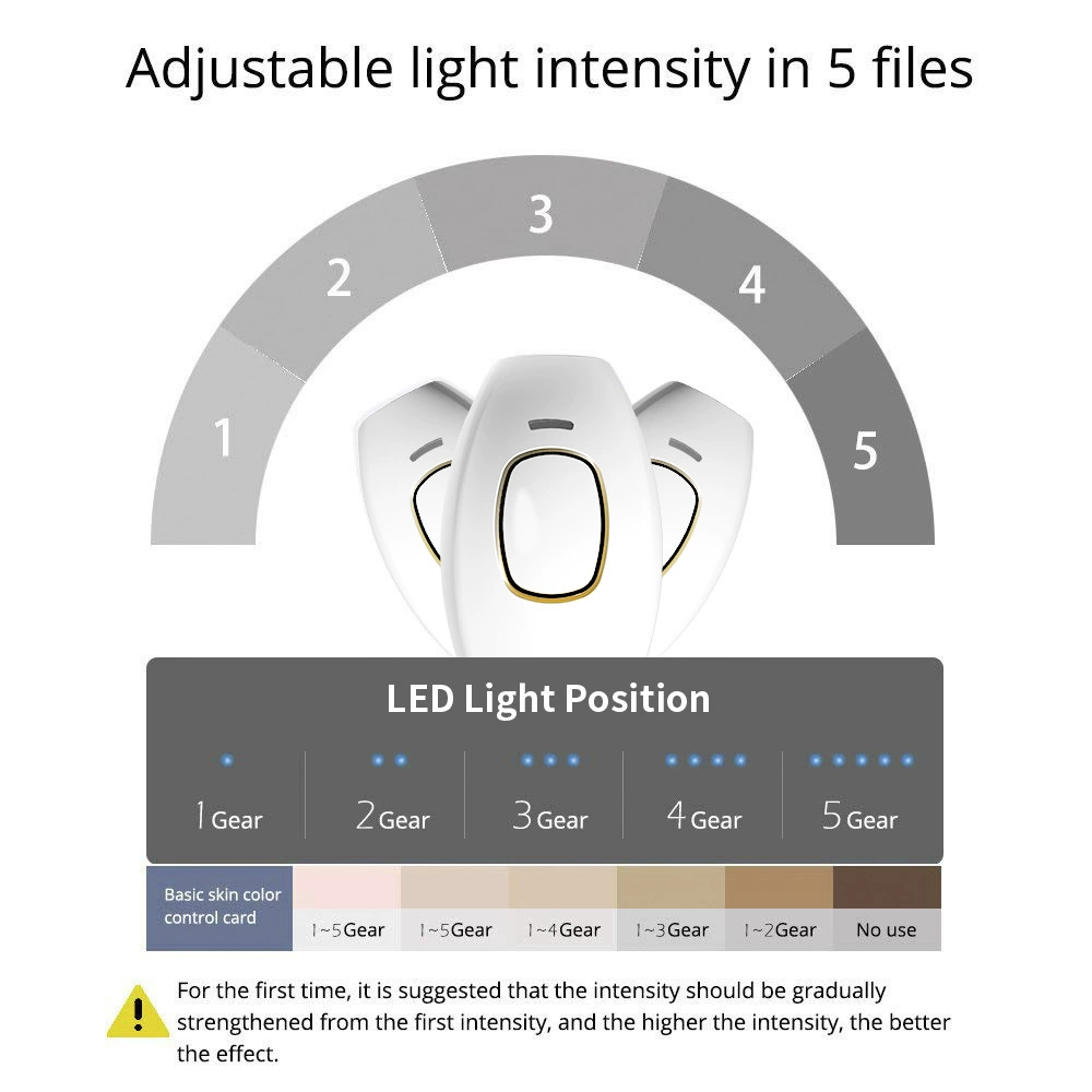 PL эпиляция устройство подходит для кожи и шерсти темные круги черный желтый (например, черный, коричневый, светильник коричневый, желтый). Но не подходит для блонд, серых, белых или красных, меланин которых не поглощает светильник.Как использовать:Шаг 1: побрите волосы и высушите кожу. Используйте медицинский спирт для очистки окна вспышки.Шаг 2: Подключите устройство, кнопка питания начнет мигать, что показывает, что находится в режиме ожидания. (Примечание: Кнопка питания-это зеленый светильник вспышки.)Шаг 3: нажмите кнопку «OFF/ON», чтобы запустить устройство, после запуска устройства нажмите «OFF/ON», чтобы настроить уровень энергии. Устройство имеет 5 уровней энергии, от 1 до 5.(синий светильник интенсивности включен)Шаг 4: Поместите окно вспышки вертикально и надежно на кожу, где вы хотите удалить, нажмите кнопку вспышки