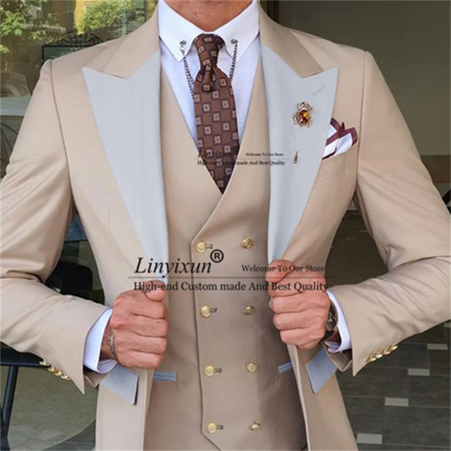 Светильник-голубые мужские костюмы, облегающие смокинги для жениха с заостренным лацканом для свадьбы, деловые костюмы из 3 предметов, Блейзер, брюки, жилет, мужской комплект на заказ