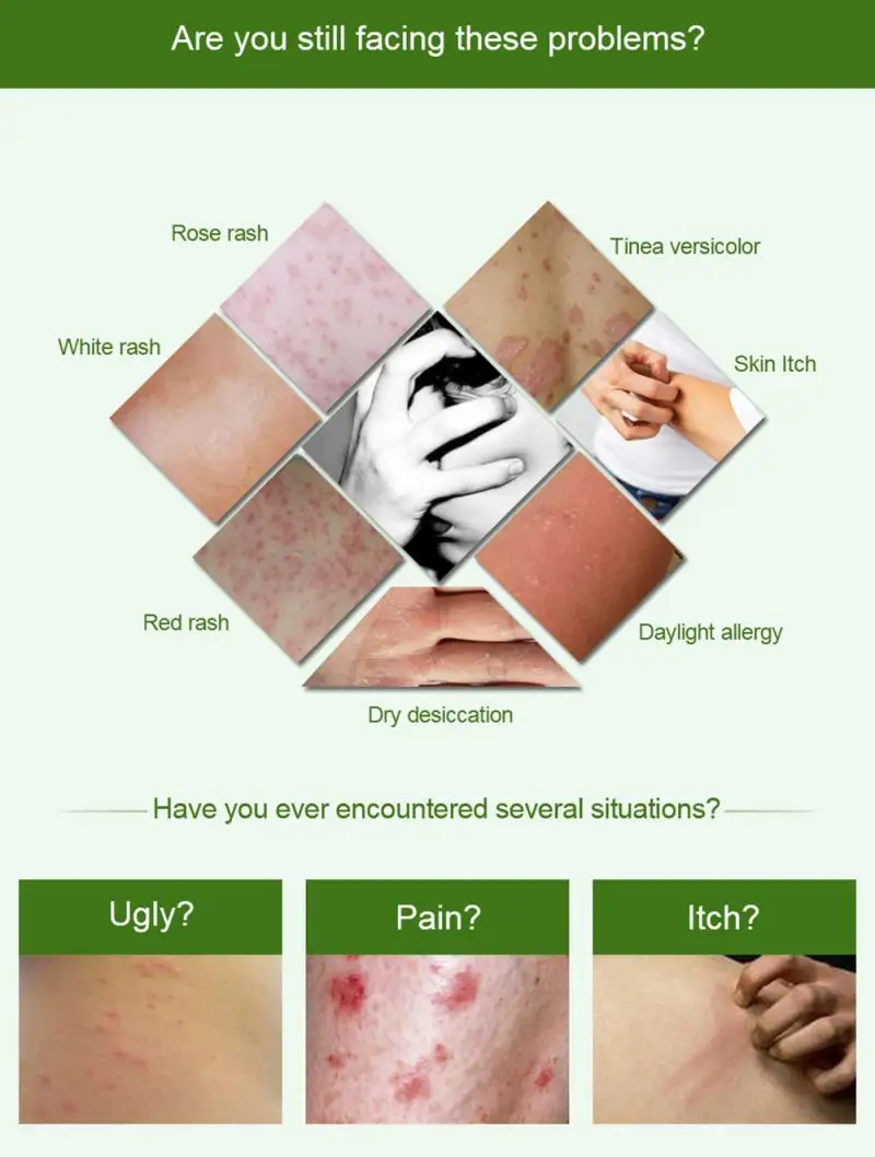 Псориаз, экзема, розацеа, острый и хронический дерматит, нейродерматит, острая и хроническая экзема, атопический дерматит, крапивница, Tinea (ступня спортсмена, ветряной Лириодендрон), Jock Body, пот, плохие ноги, пилинг ног, пузыри, зуд ног средство от зуда в области гениталий, Анальный зуд, геморрой, укусы насекомых, Акне, колючий жар, кожный зуд.