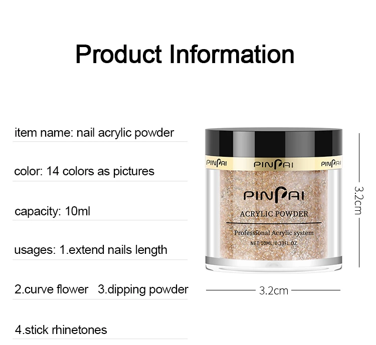 Цвета: 14 цветов, как на картинкеЕмкость: 10 млНабор акриловых порошков включает: акриловый порошок + кисть для ногтей + акриловая жидкость + хрустальный стаканчик + бумажный держатель для ногтейИспользование:1. Удлиняет длину ногтей2. Кривые цветы3. Приклеиваются Стразы4. Как окунающий порошокИспользование шагов:1. Полировка Ногтей2. Очистка ногтей3. Окуните акриловую жидкость4. Окуните акриловый порошок5. Нанесите акриловый порошок равномерно6. Польский порошок7. Очистка ногтей8. Нанесите верхнее пальто9. Используйте лампу для сушки ногтей, закончите