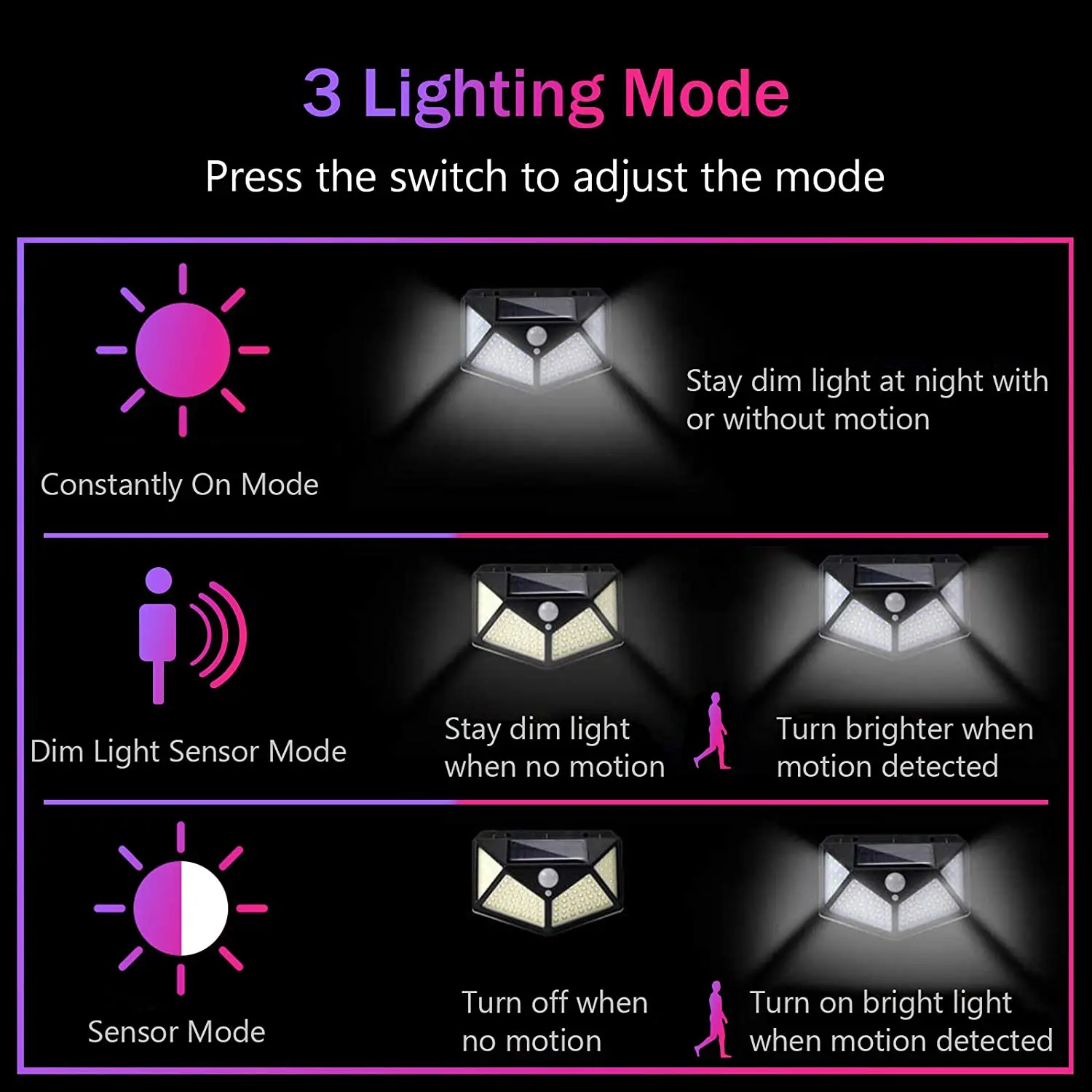 ✿Супер яркие солнечные огни: Этот солнечный свет с 100 супер яркий светодиодный бусины, обеспечивает отличную освещенность до 1000 люмен, что намного ярче других подобных светодиодный солнечного света. ✿3 режима интеллектуального освещения: ①Сильный светильник с датчиком,②Тусклый светильник с датчиком,③Режим тусклый длинный светильник. Выберите различные режимы в различных сценариях в соответствии с вашими потребностями, которые могут полностью удовлетворить все ваши потребности. ✿Устойчивость к погодным условиям:Наши устройства изготовлены из ударопрочного АБС, который может выдерживать снег, дождь и другие экстремальные погодные условия. IP65 Водонепроницаемый и термостойкий, солнечные огни, подходит для большинства видов погодных условий. ✿Удобно использовать:Компактная конструкция позволяет легко установить на стену с помощью двух прилагаемых винтов. Поскольку они беспроводные, вы можете установить эти огни в любом месте, будь то наружные ворота, подъездные дорожки, забор, патио или сад.
